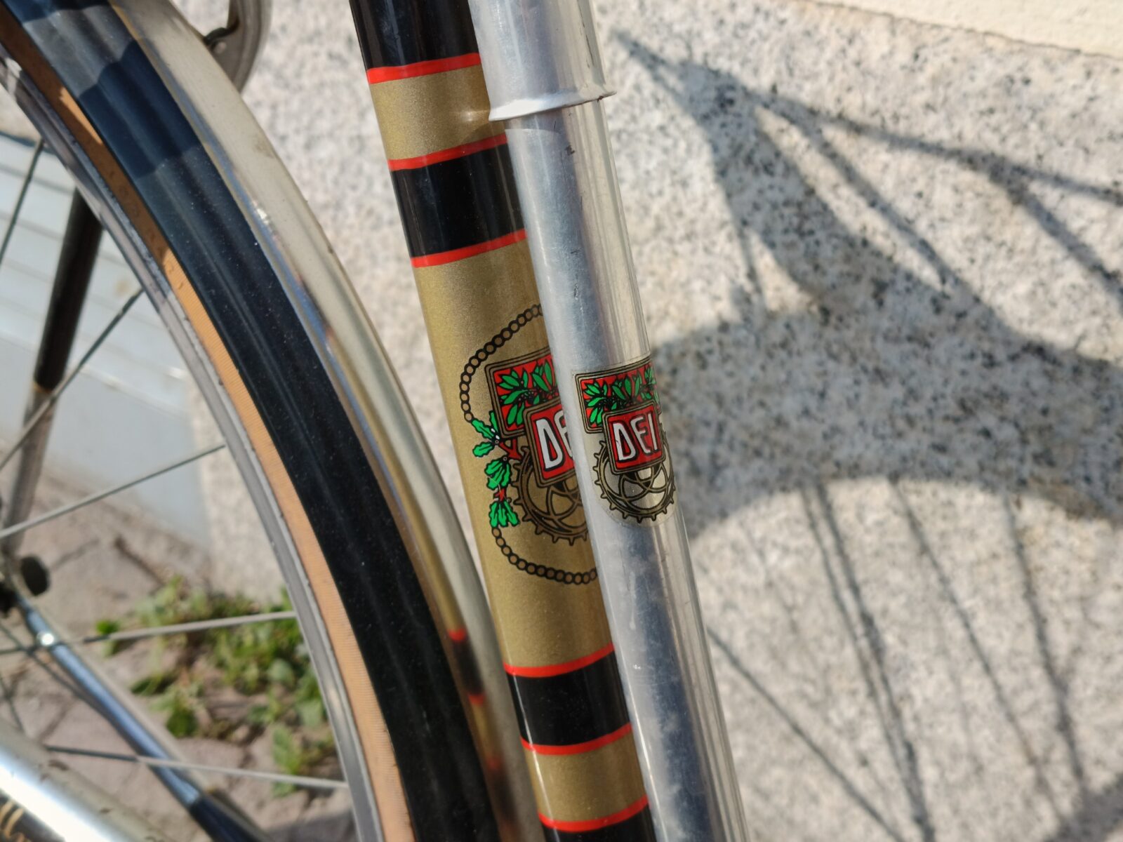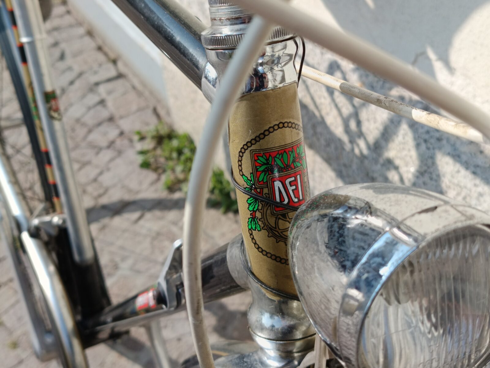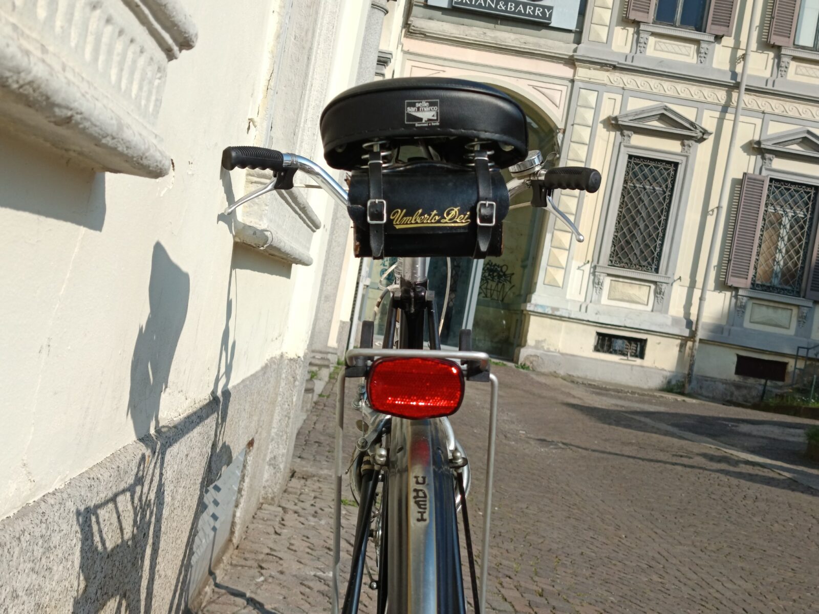“Questa Umberto Dei ha il fascino delle biciclette che non hanno bisogno di effetti particolari per farsi notare. La sua forza sta proprio nell’essere rimasta quasi tutta originale, con quell’equilibrio raro tra eleganza, sobrietà e autenticità che solo certi mezzi d’epoca riescono ancora a trasmettere. Il telaio nero con dettagli oro e filetti rossi conserva un carattere classico e distinto, mentre la componentistica, la fanaleria, il portapacchi, il carter e i particolari cromati restituiscono l’idea di una bici nata per durare e per accompagnare la vita di tutti i giorni con stile. È una presenza discreta ma piena di personalità, di quelle che raccontano subito una storia ancora prima di essere pedalate.
