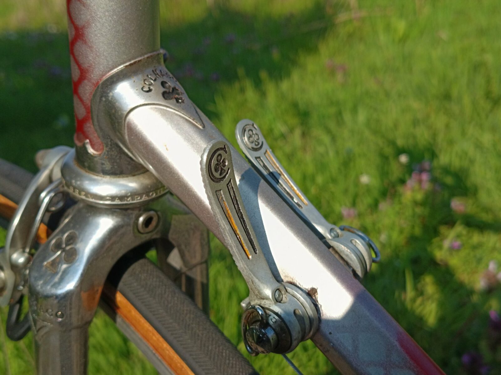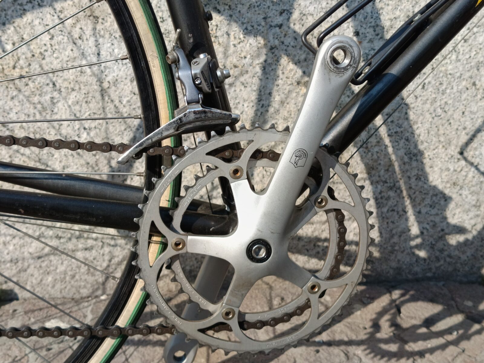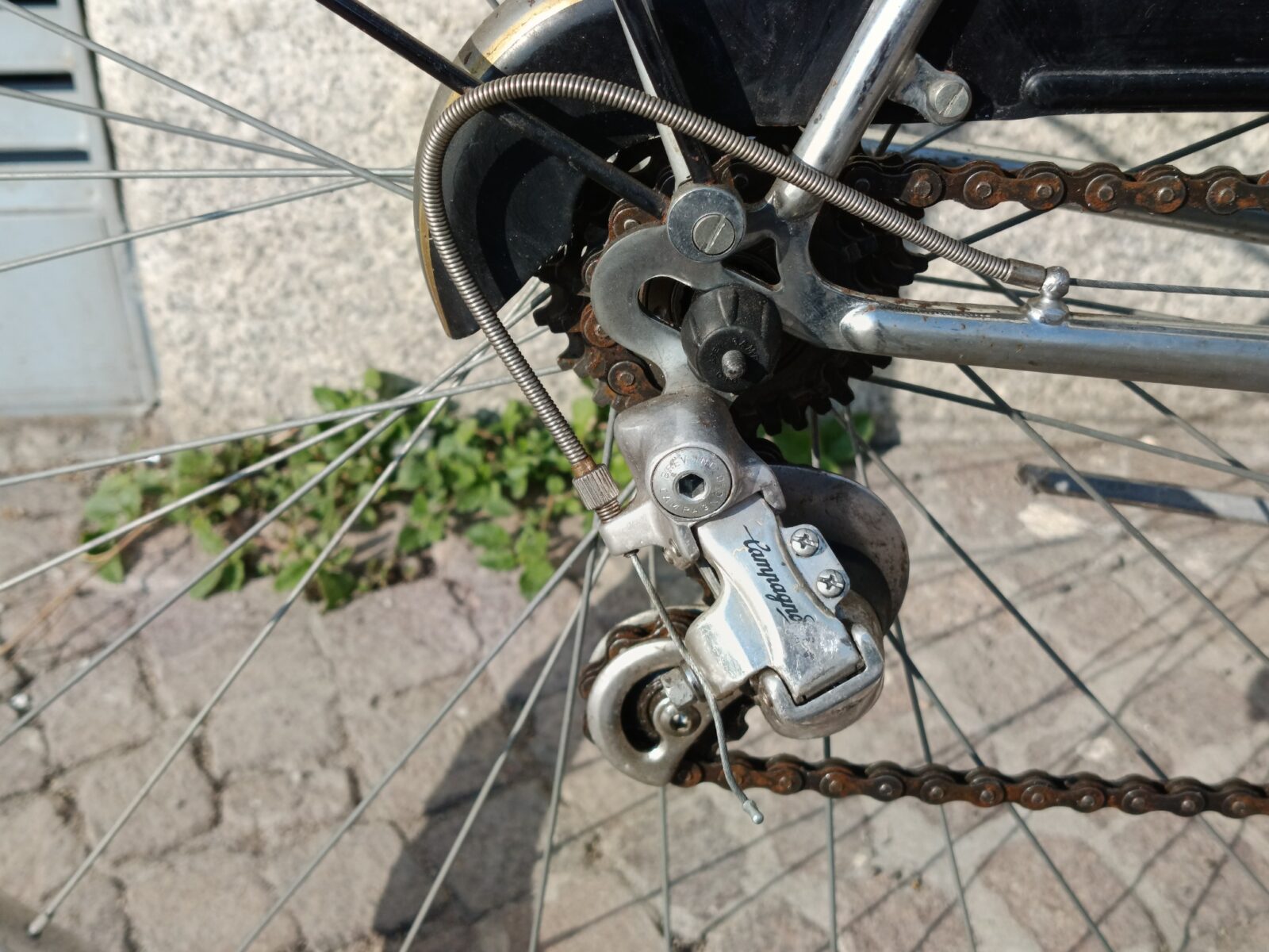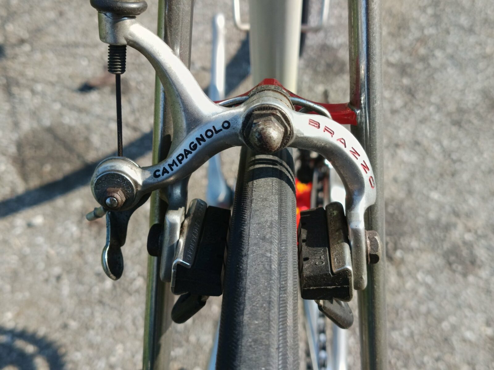 Dal punto di vista tecnico, la bici monta componentistica coerente con l’epoca e con un’impostazione sportiva ma elegante. Il gruppo Campagnolo, visibile in diversi dettagli come i freni e il movimento centrale, è una garanzia di affidabilità e rappresenta una scelta quasi obbligata per chi voleva il meglio su strada. La guarnitura con corona lavorata e le finiture in alluminio lucidato aggiungono un ulteriore livello di raffinatezza.