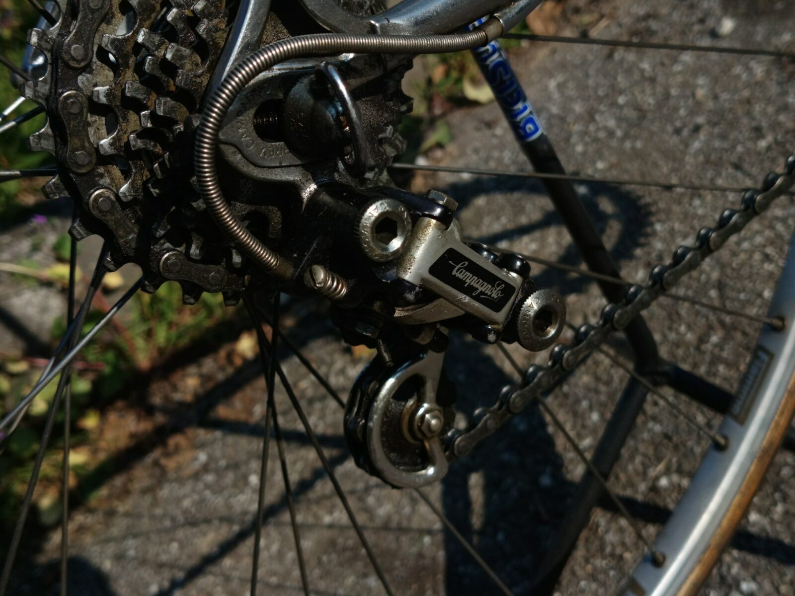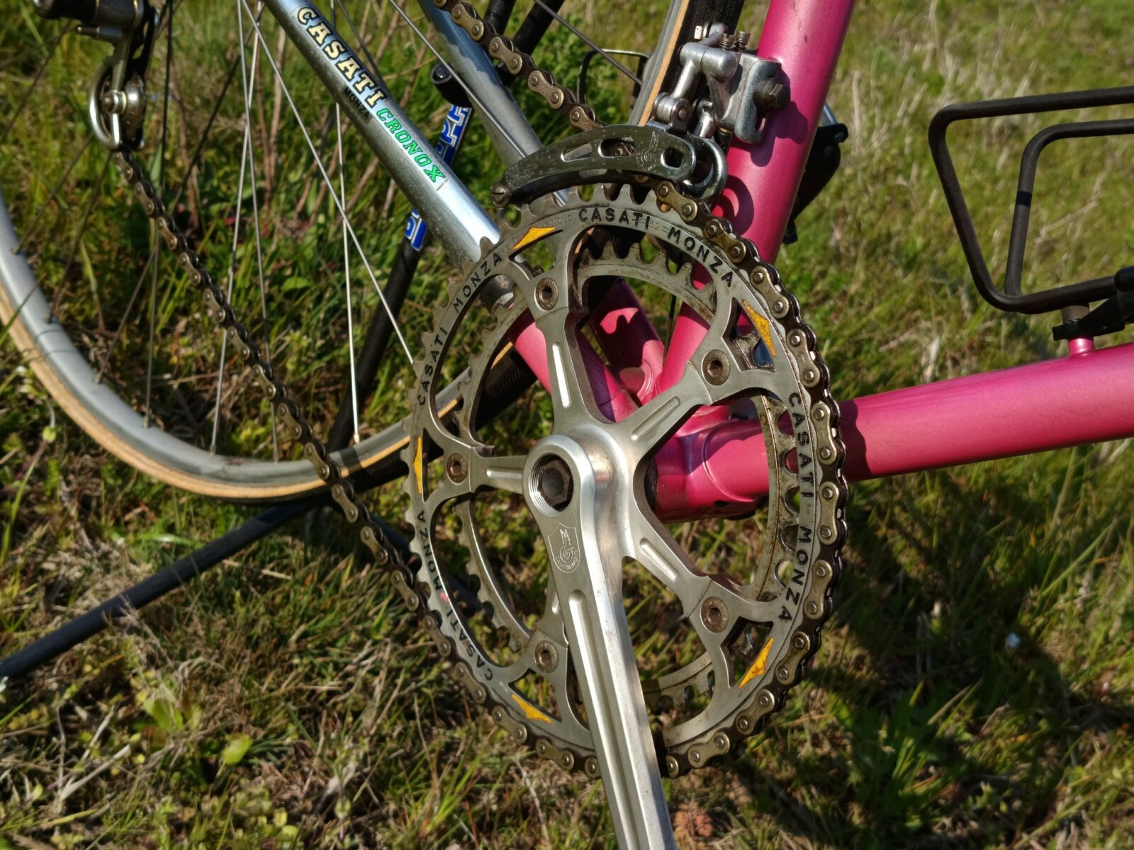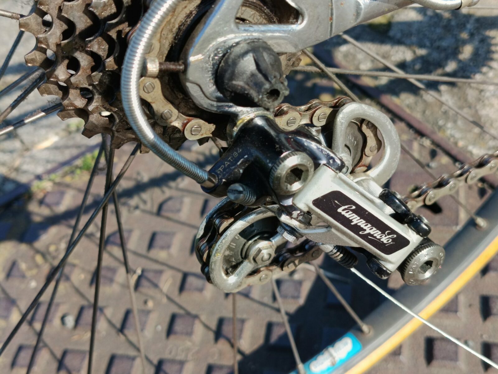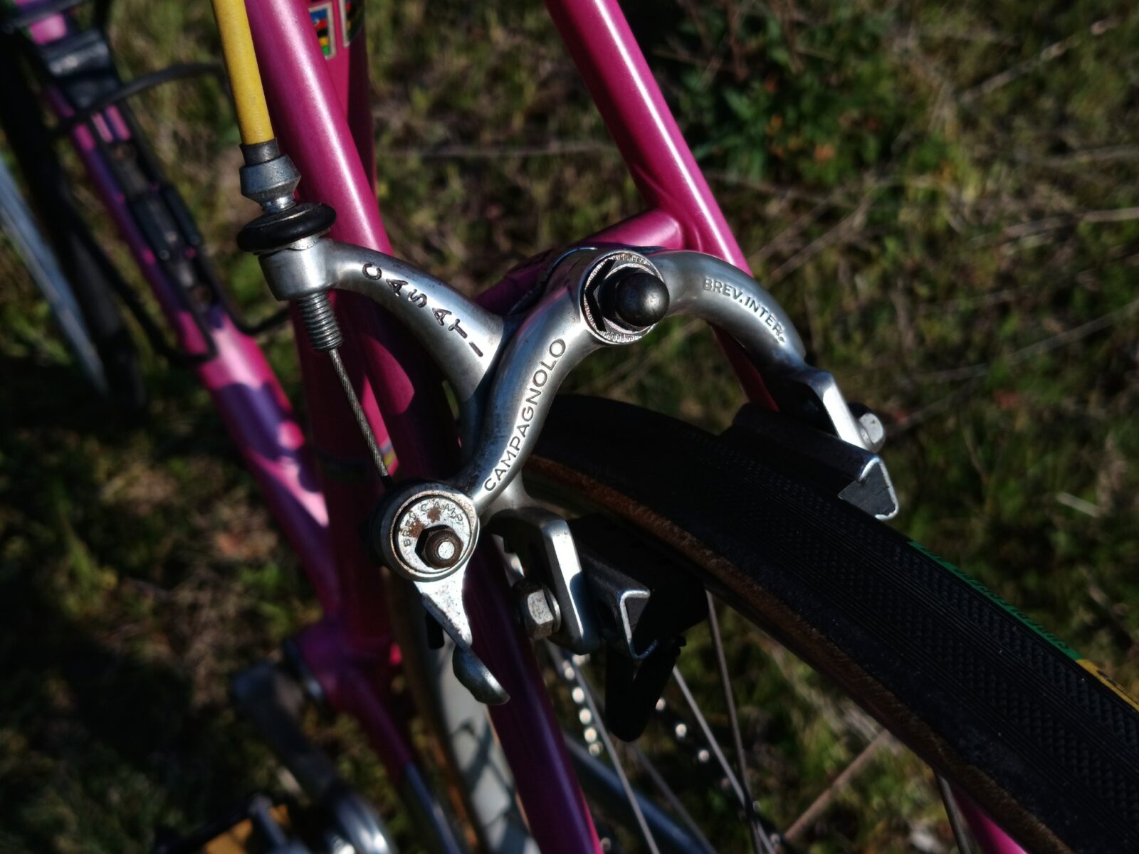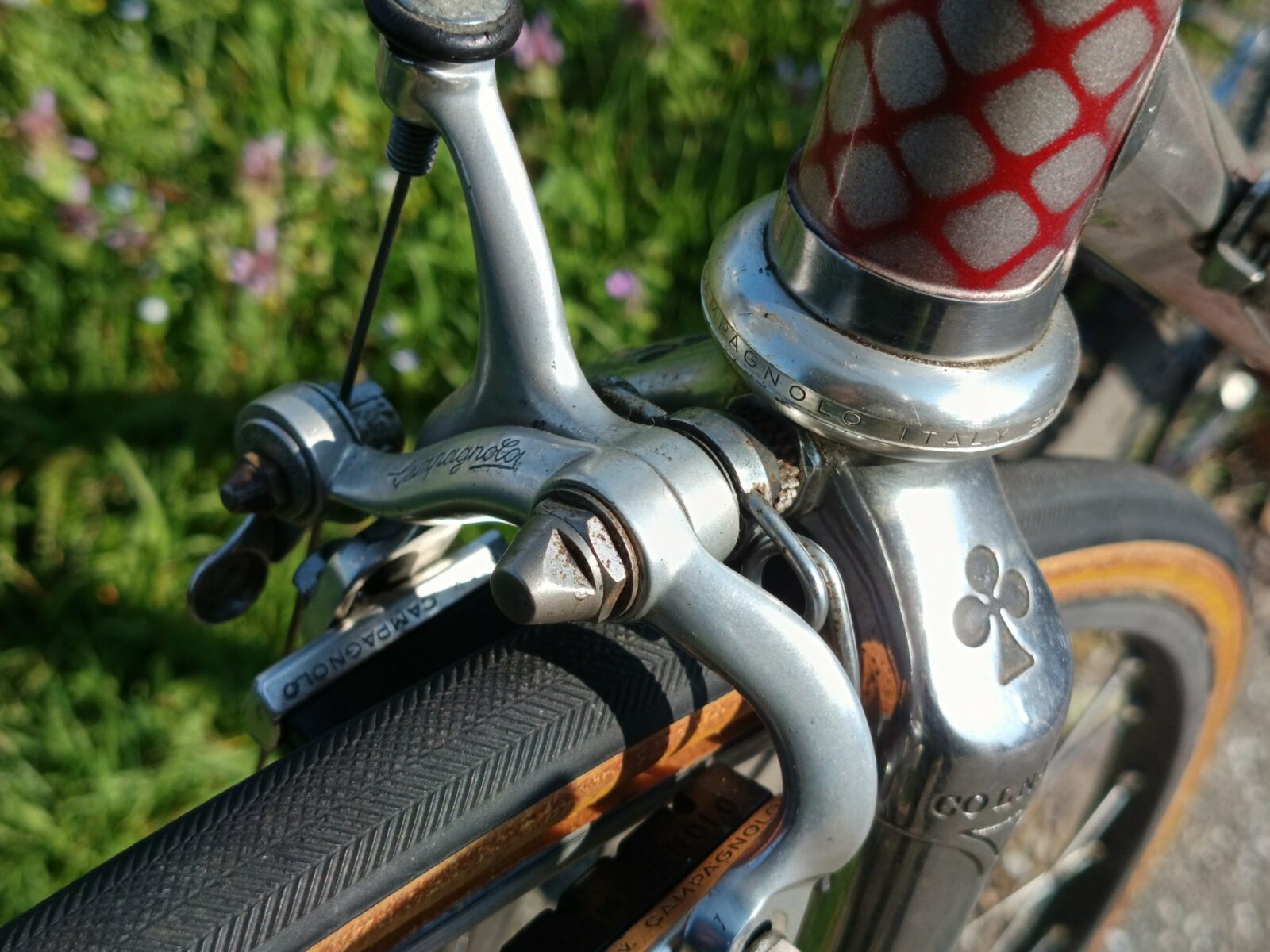 Dal punto di vista tecnico, la bici monta componentistica coerente con l’epoca e con un’impostazione sportiva ma elegante. Il gruppo Campagnolo, visibile in diversi dettagli come i freni e il movimento centrale, è una garanzia di affidabilità e rappresenta una scelta quasi obbligata per chi voleva il meglio su strada. La guarnitura con corona lavorata e le finiture in alluminio lucidato aggiungono un ulteriore livello di raffinatezza.