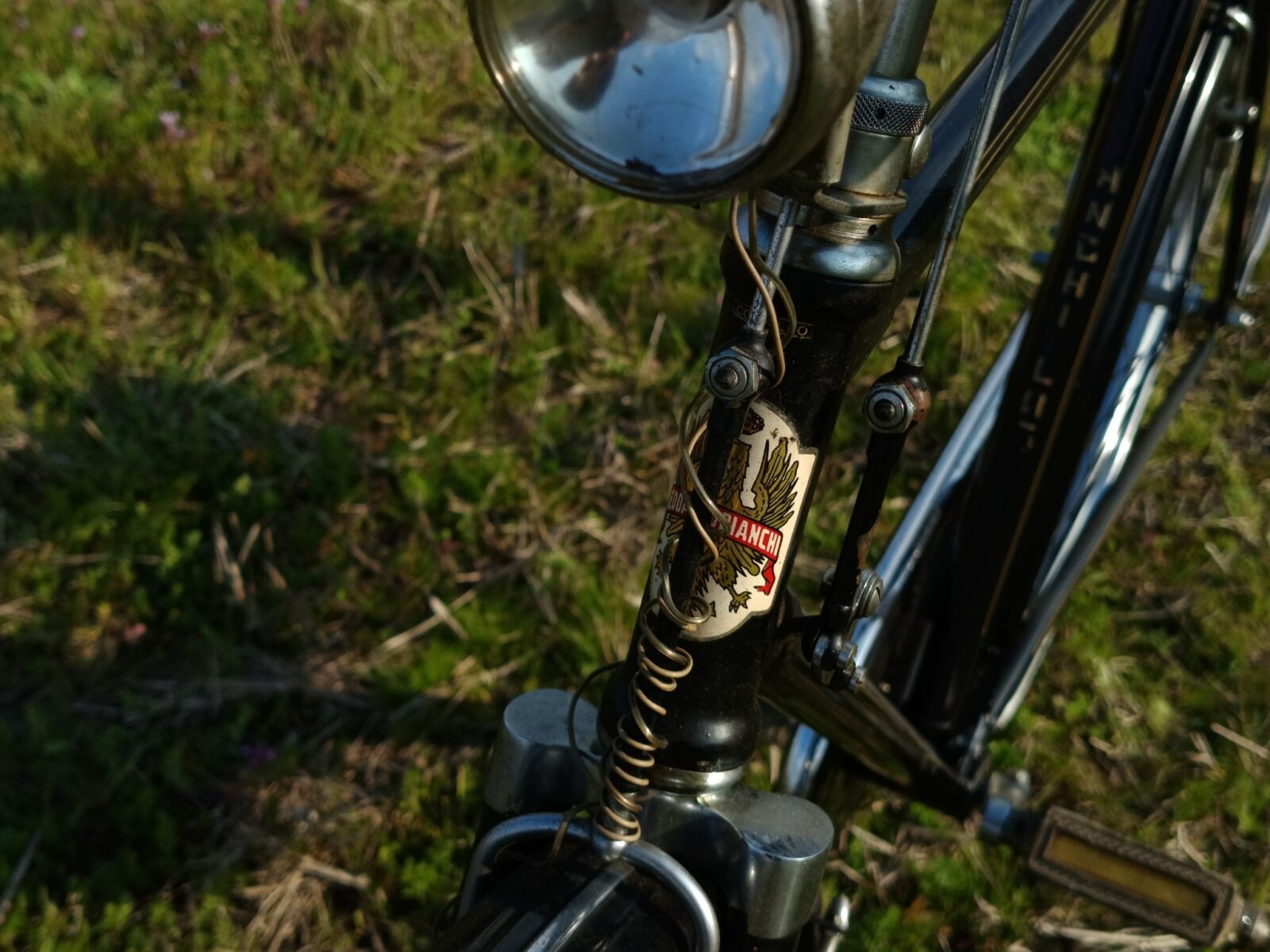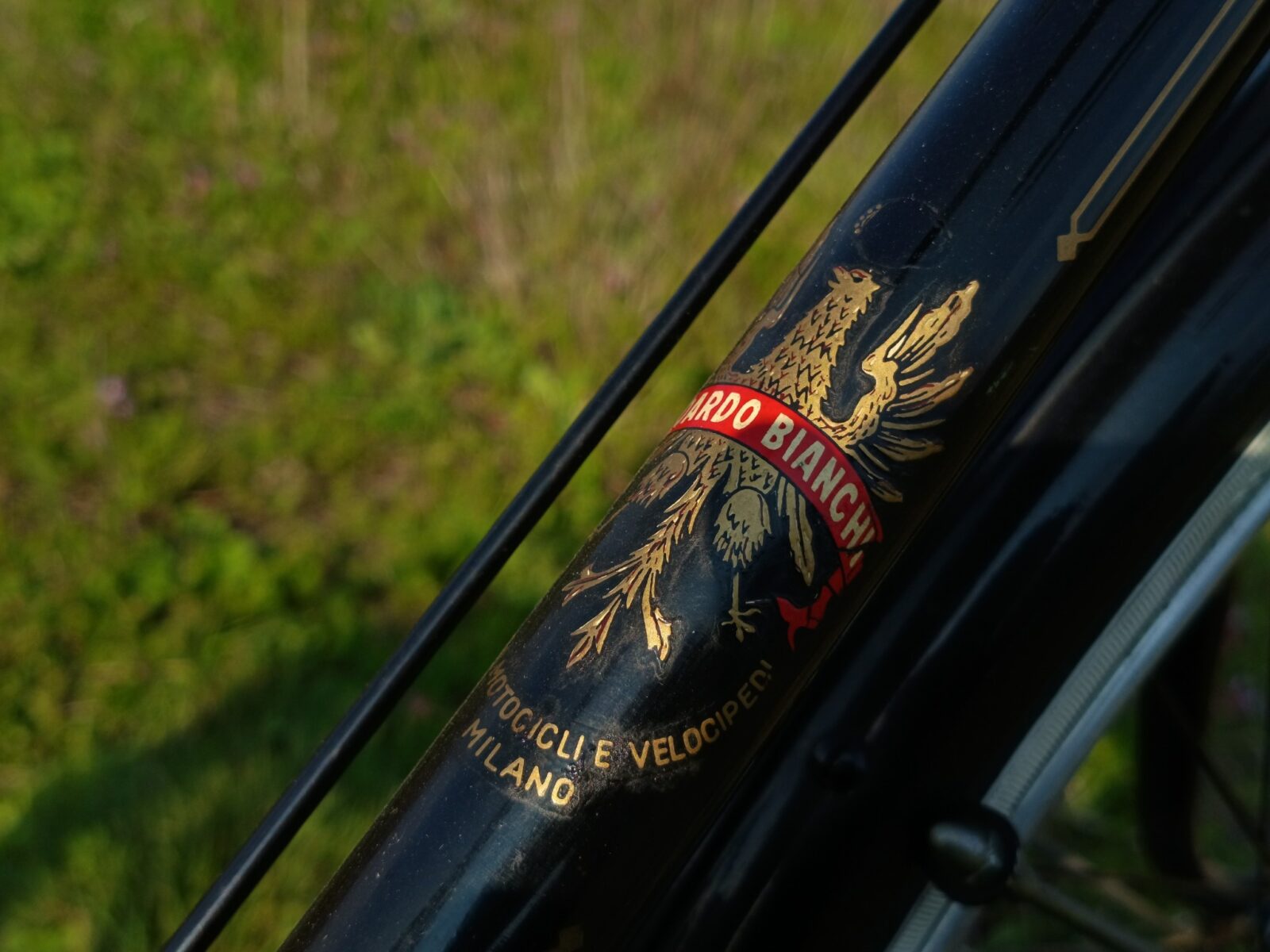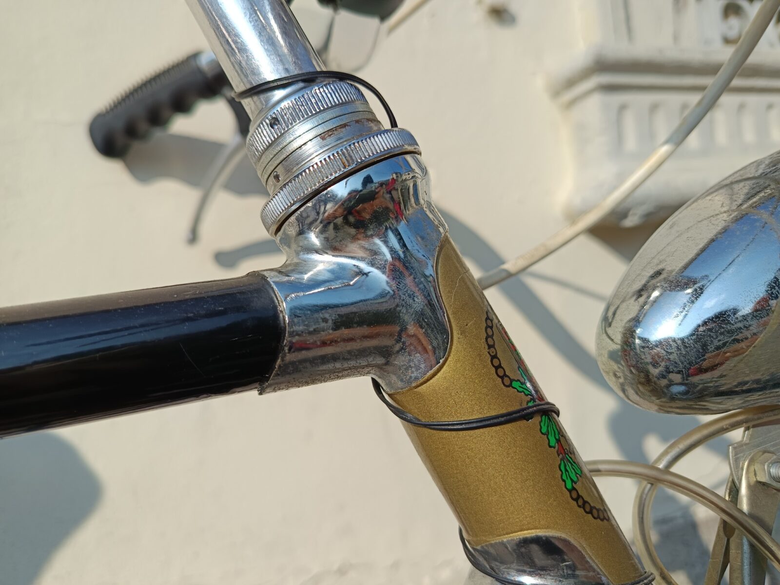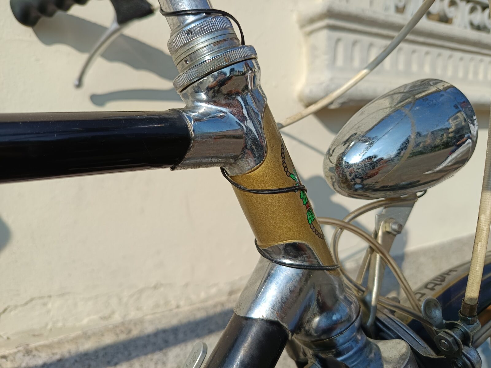 Il telaio nero con filetti dorati è sobrio ma raffinato, tipico delle produzioni Bianchi di metà Novecento: linee pulite, geometrie comode e una presenza discreta ma autorevole. I dettagli dorati e le decal con l’aquila, ancora visibili, richiamano l’identità storica del marchio e contribuiscono a darle un fascino autentico, non ricostruito.