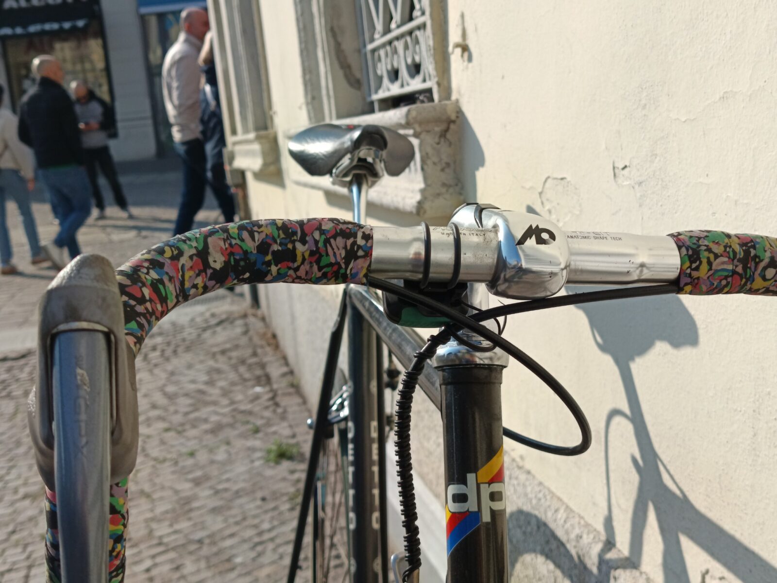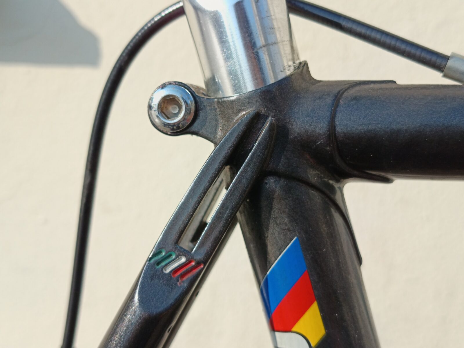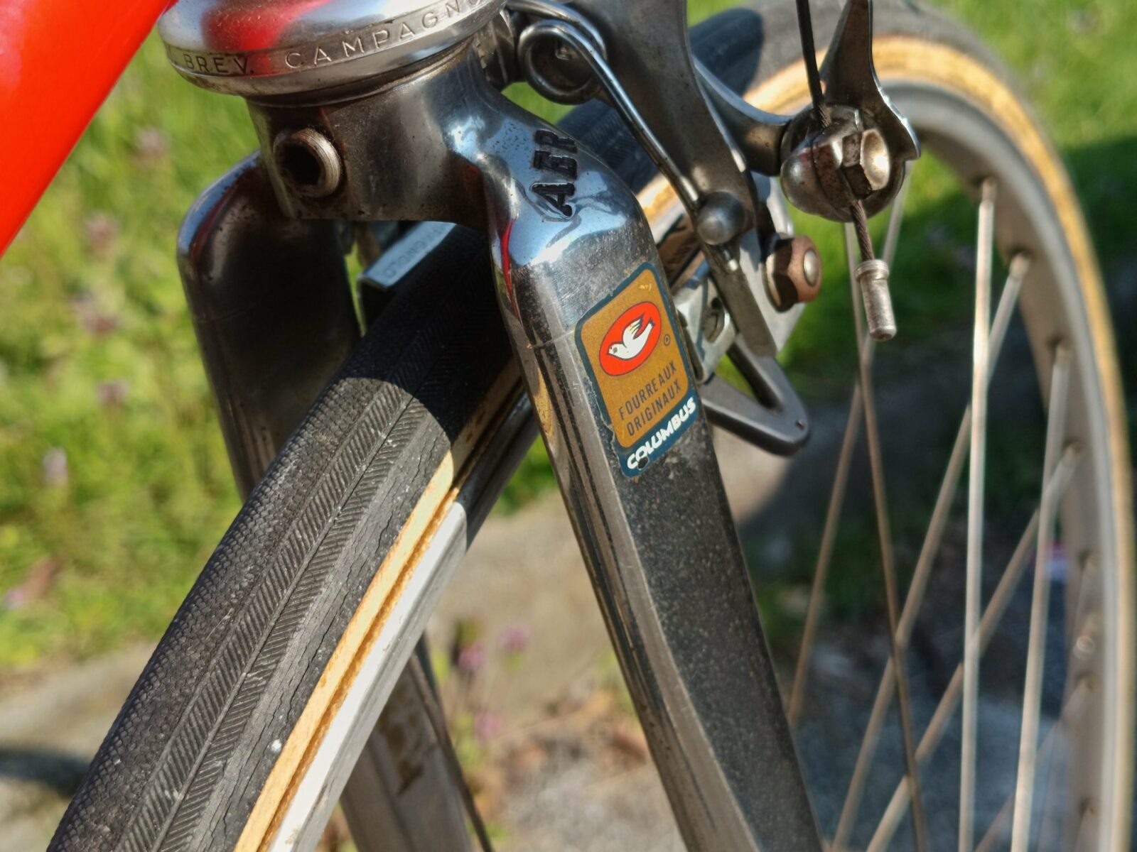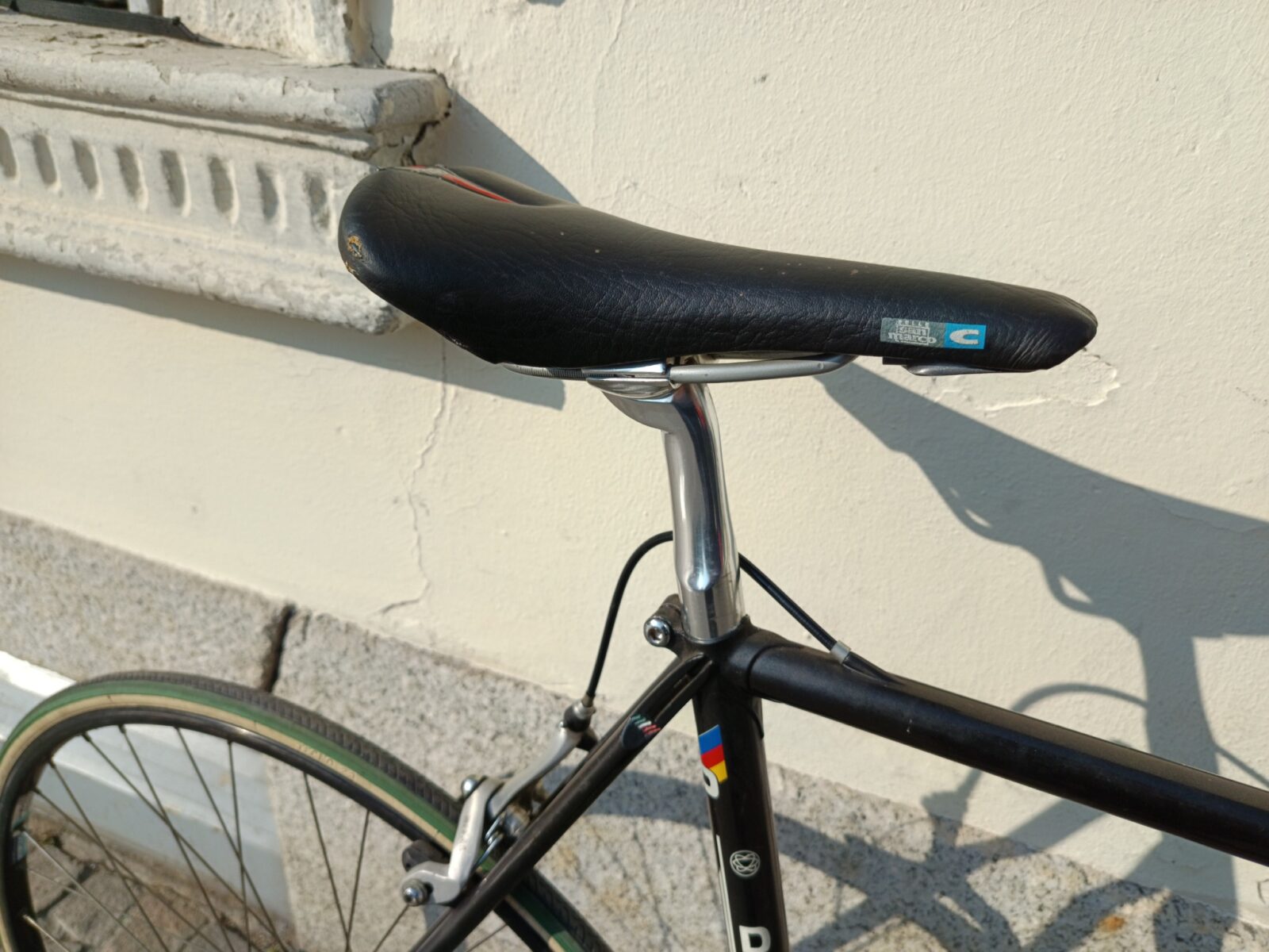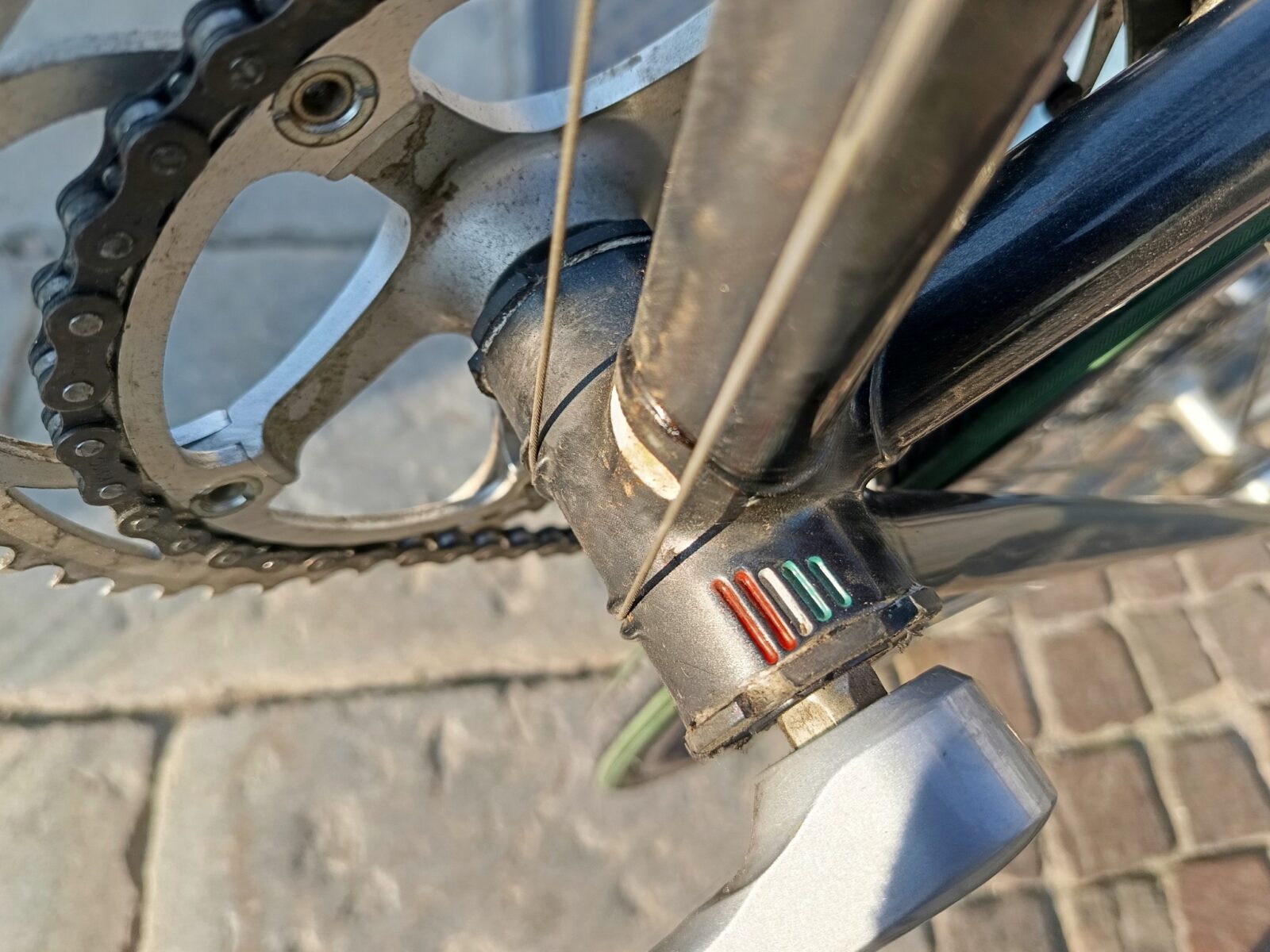 Interessante anche la forcella con adesivo Columbus, che suggerisce l’utilizzo di tubazioni di qualità, molto diffuse tra i telaisti italiani dell’epoca. Questo dettaglio rafforza l’idea di una bici pensata per essere performante ma anche durevole nel tempo.
