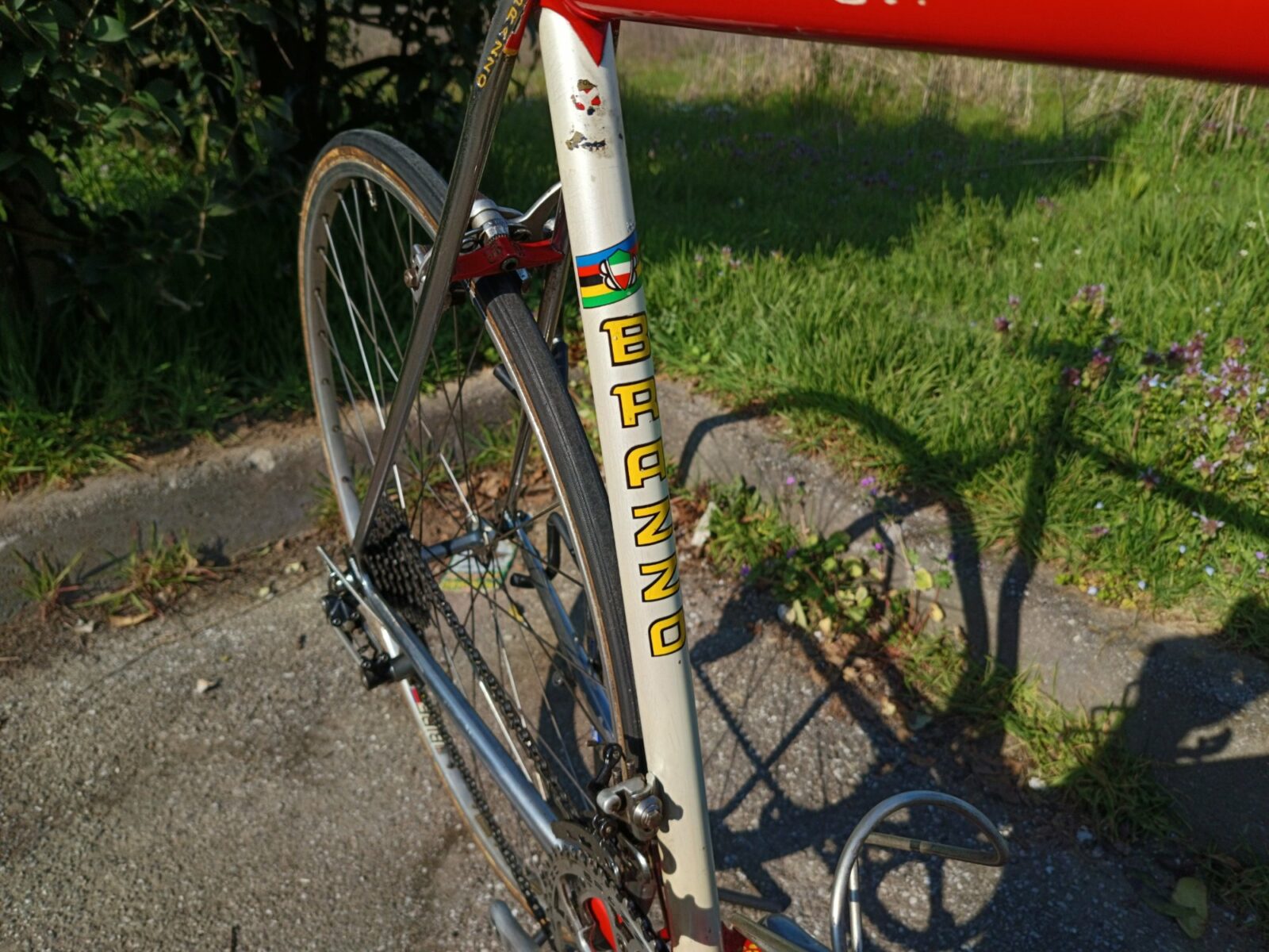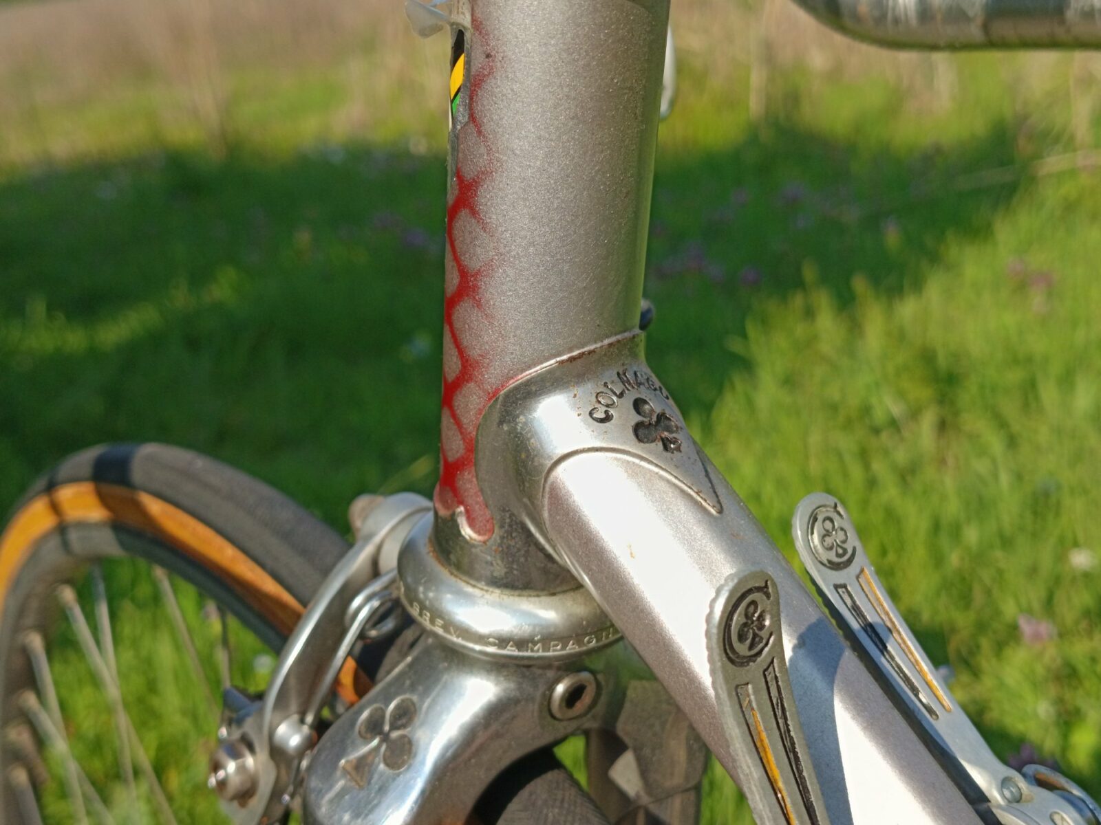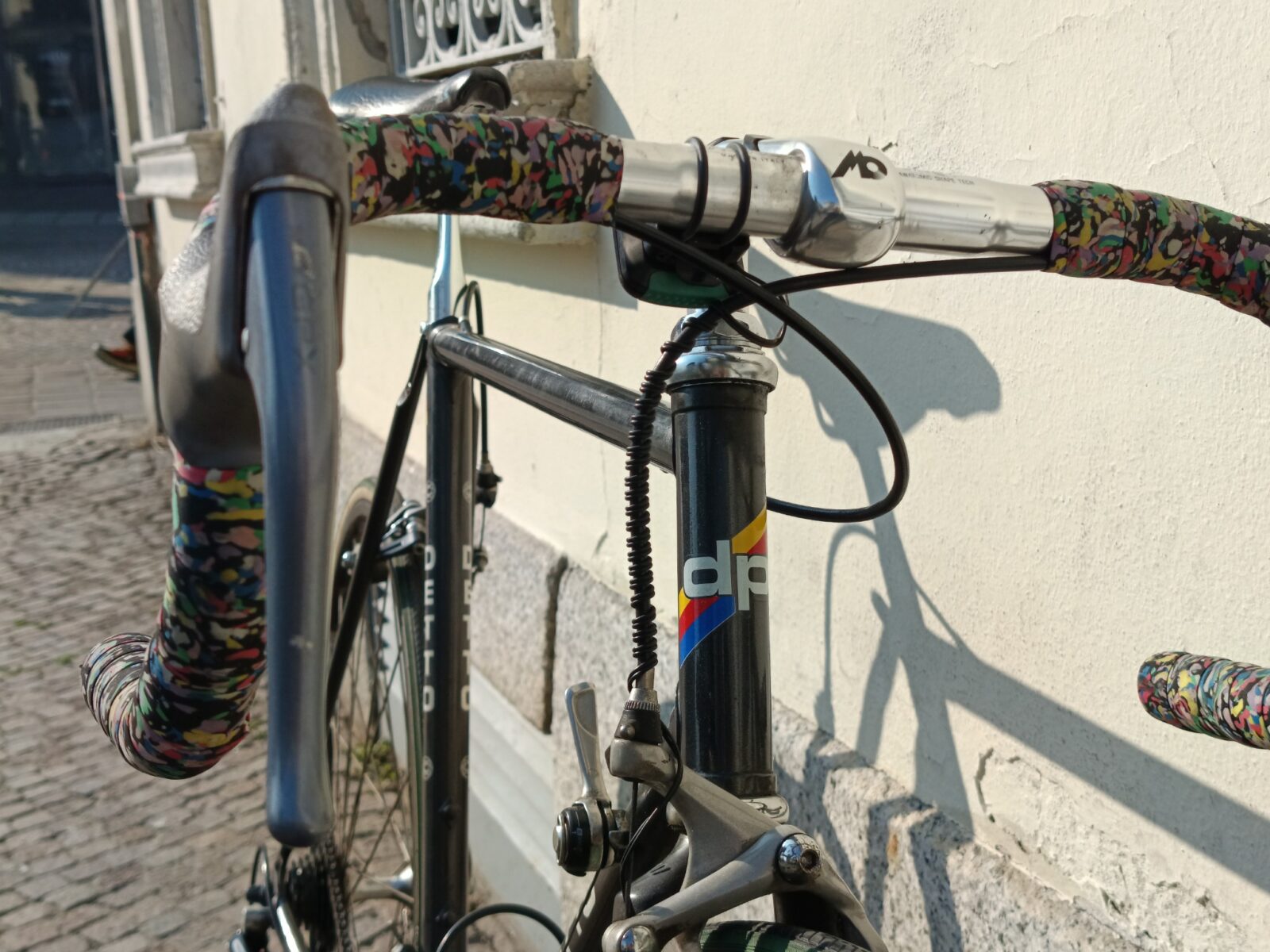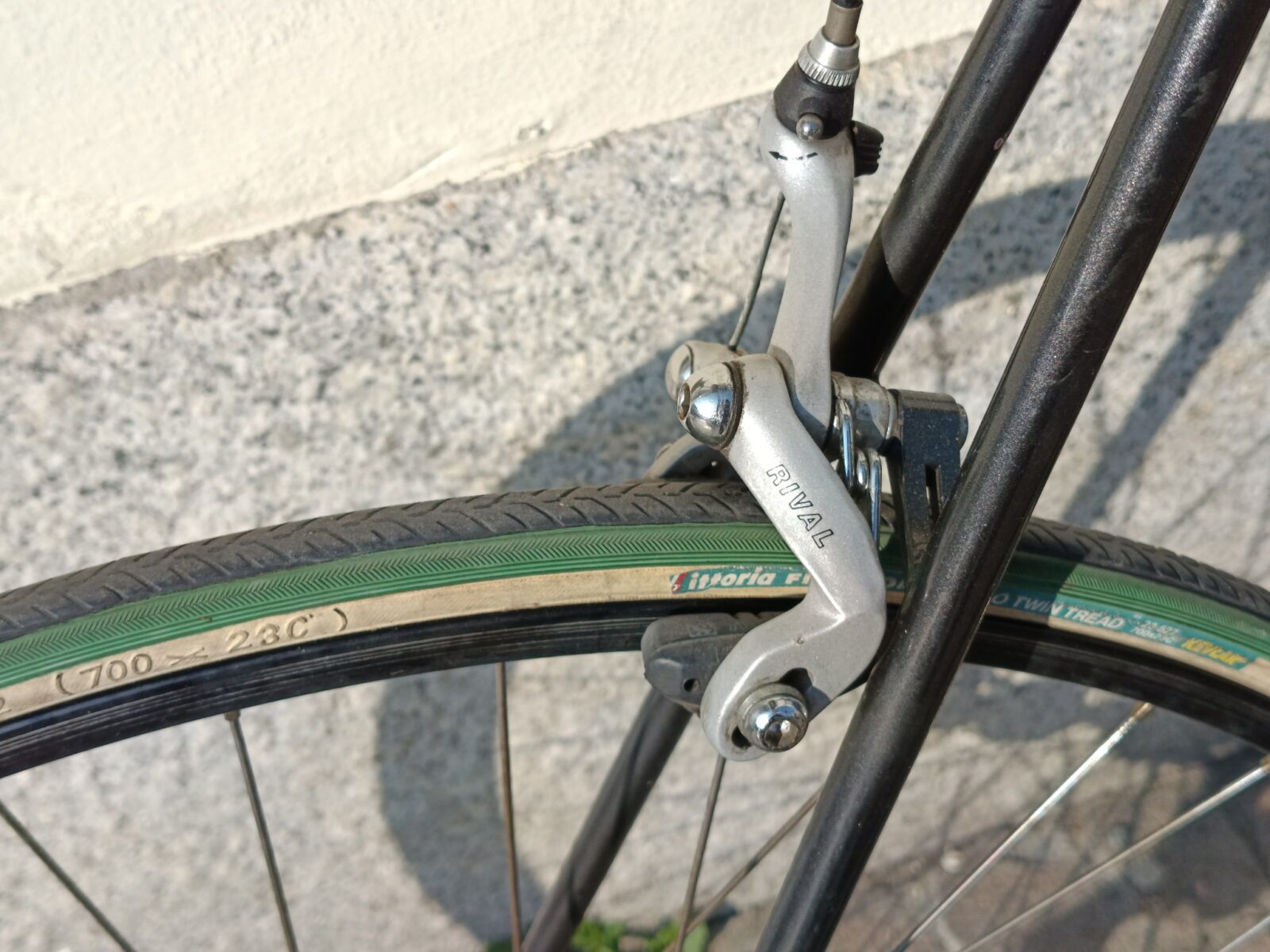 Interessante anche la forcella con adesivo Columbus, che suggerisce l’utilizzo di tubazioni di qualità, molto diffuse tra i telaisti italiani dell’epoca. Questo dettaglio rafforza l’idea di una bici pensata per essere performante ma anche durevole nel tempo.
