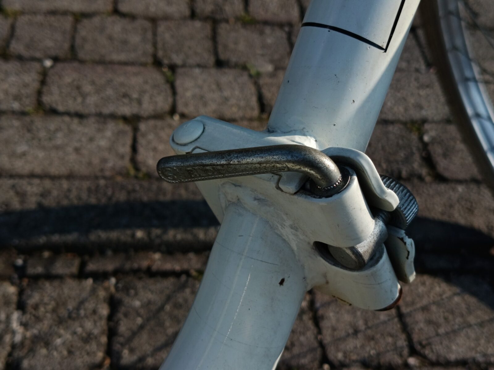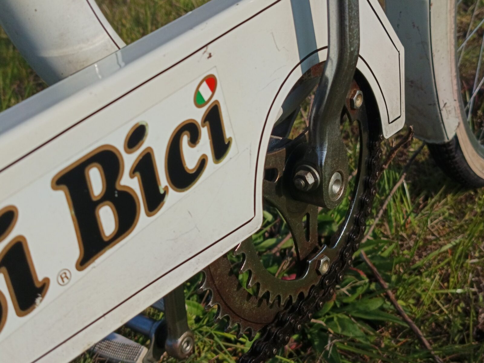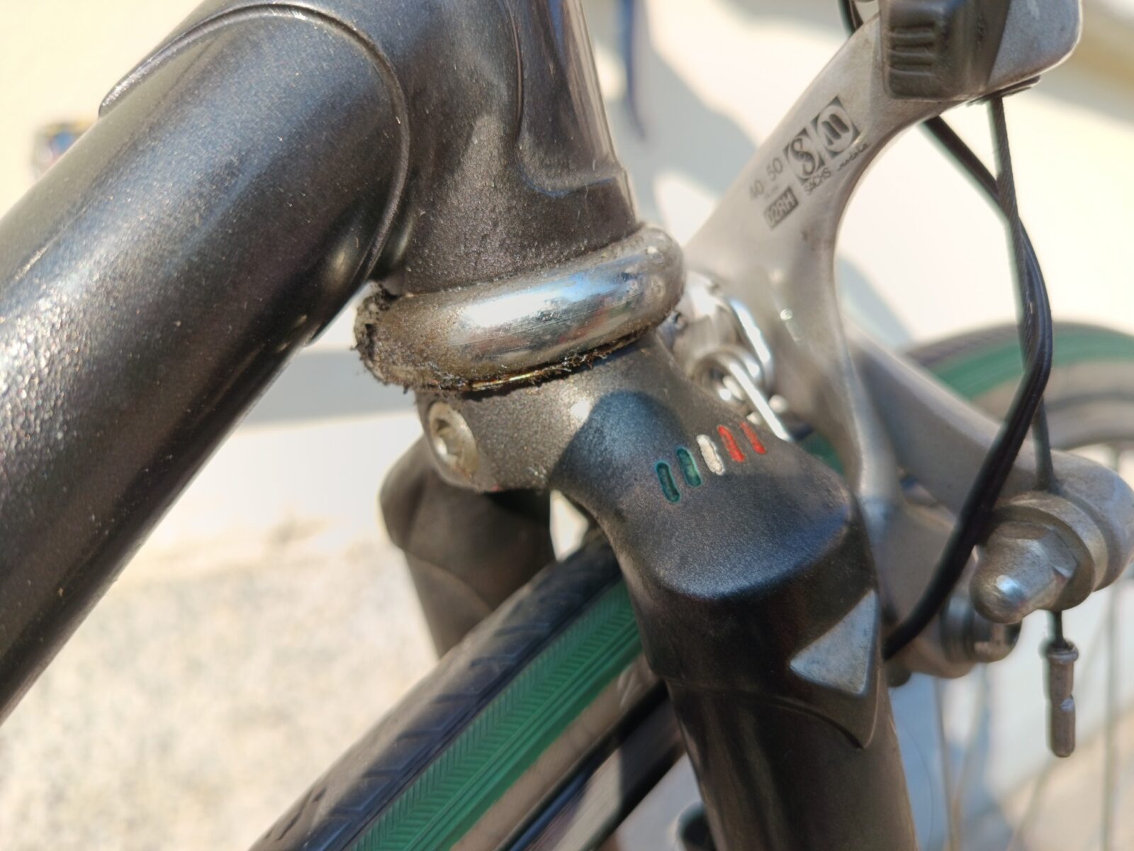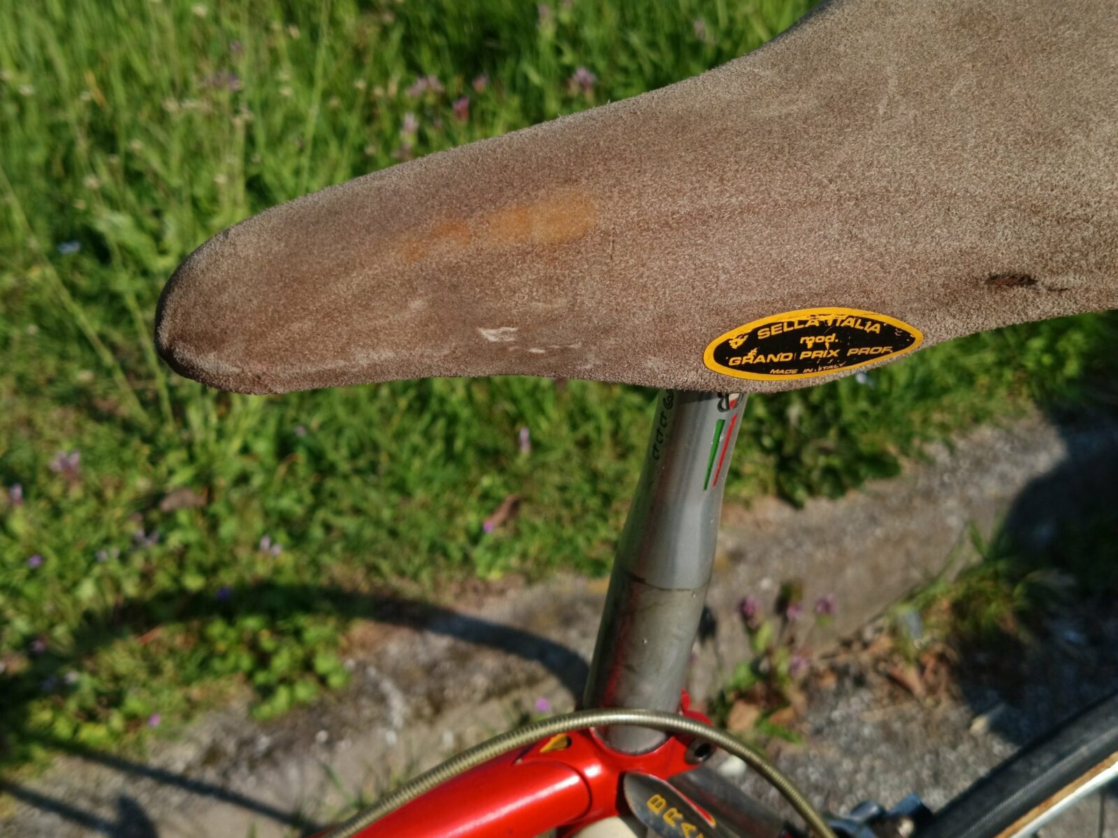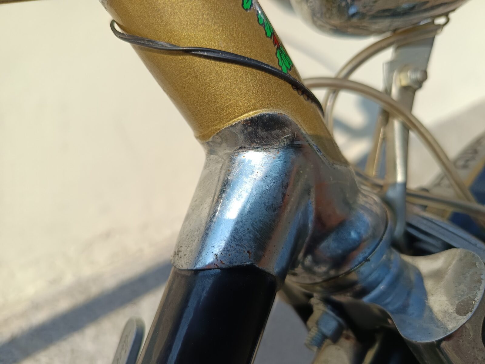 Interessante anche la forcella con adesivo Columbus, che suggerisce l’utilizzo di tubazioni di qualità, molto diffuse tra i telaisti italiani dell’epoca. Questo dettaglio rafforza l’idea di una bici pensata per essere performante ma anche durevole nel tempo.