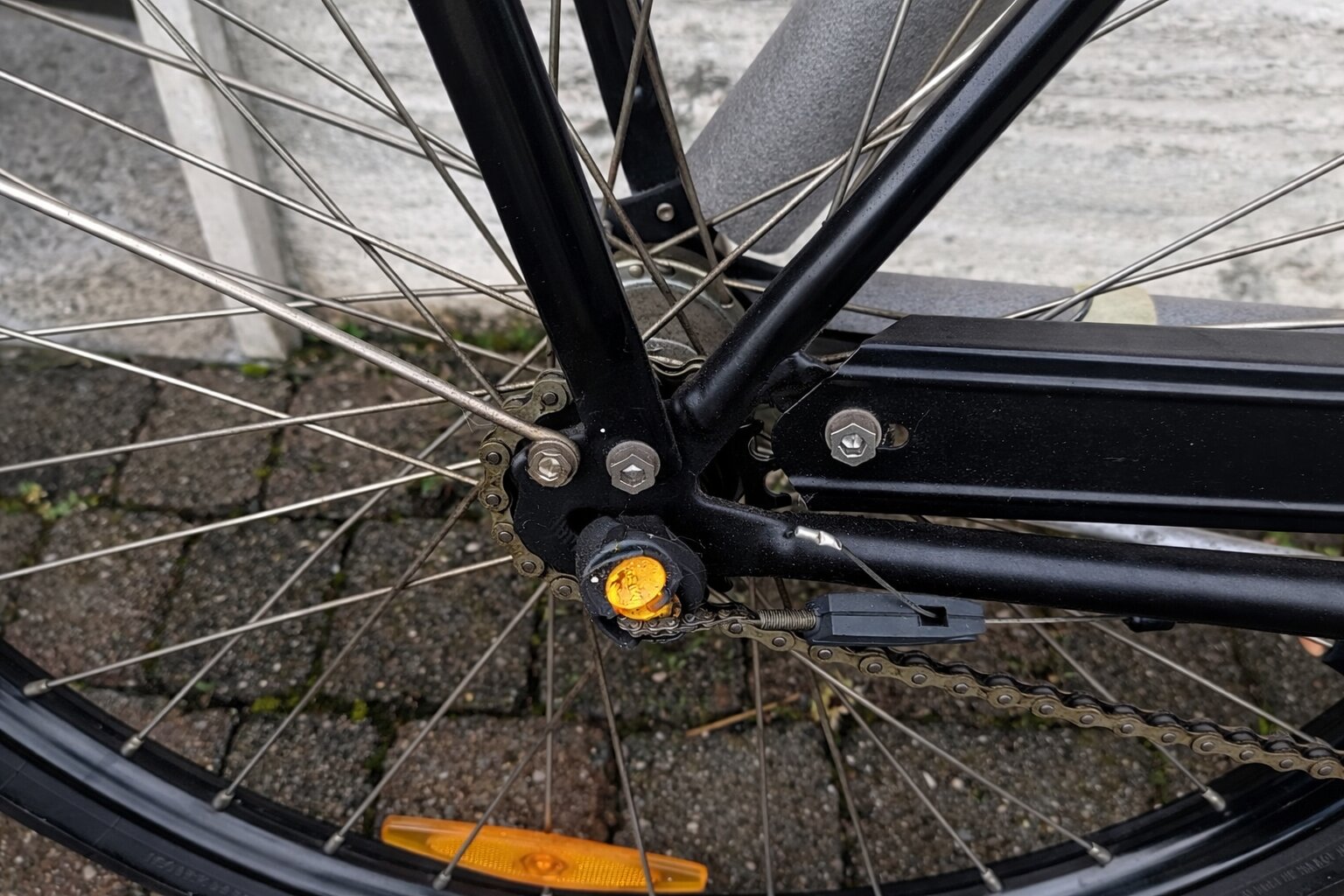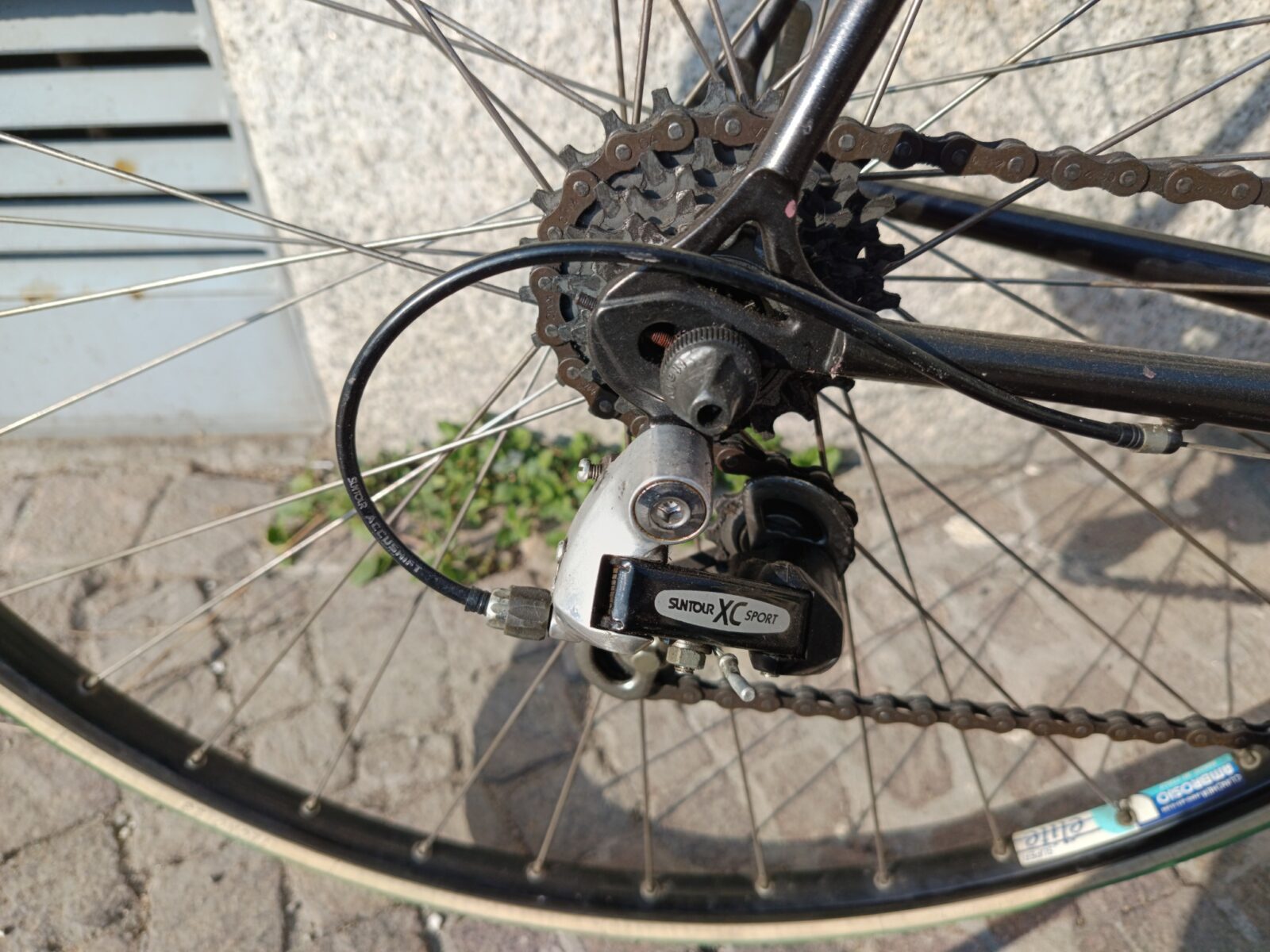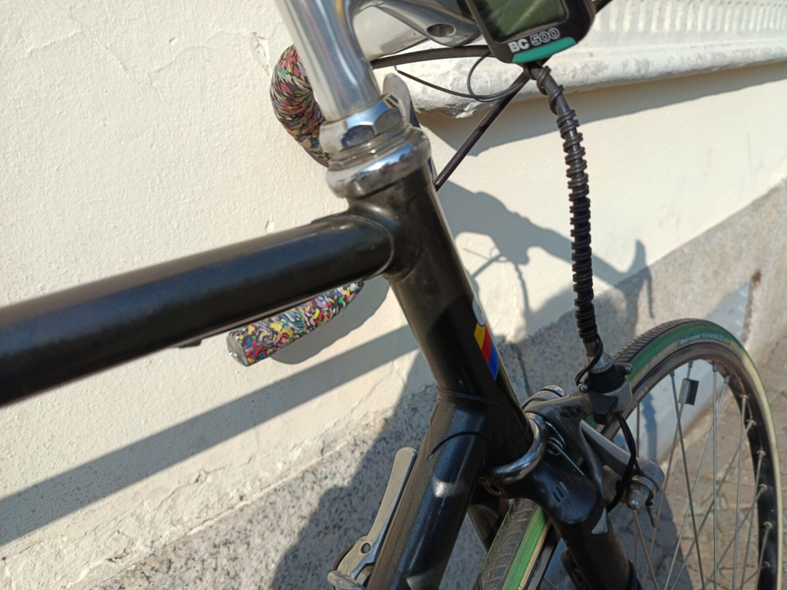 Il cuore della bici è proprio il telaio, probabilmente realizzato con tubazioni di alta qualità, pensato per offrire un equilibrio tra rigidità e comfort sulle lunghe distanze. I dettagli come i passaggi cavi esterni, le congiunzioni marcate e la geometria tradizionale raccontano un’epoca in cui ogni bici veniva costruita con una forte identità meccanica, oltre che estetica.