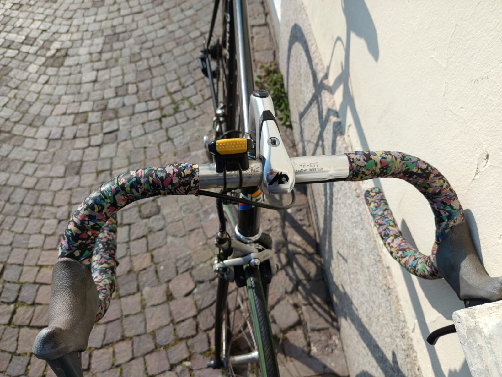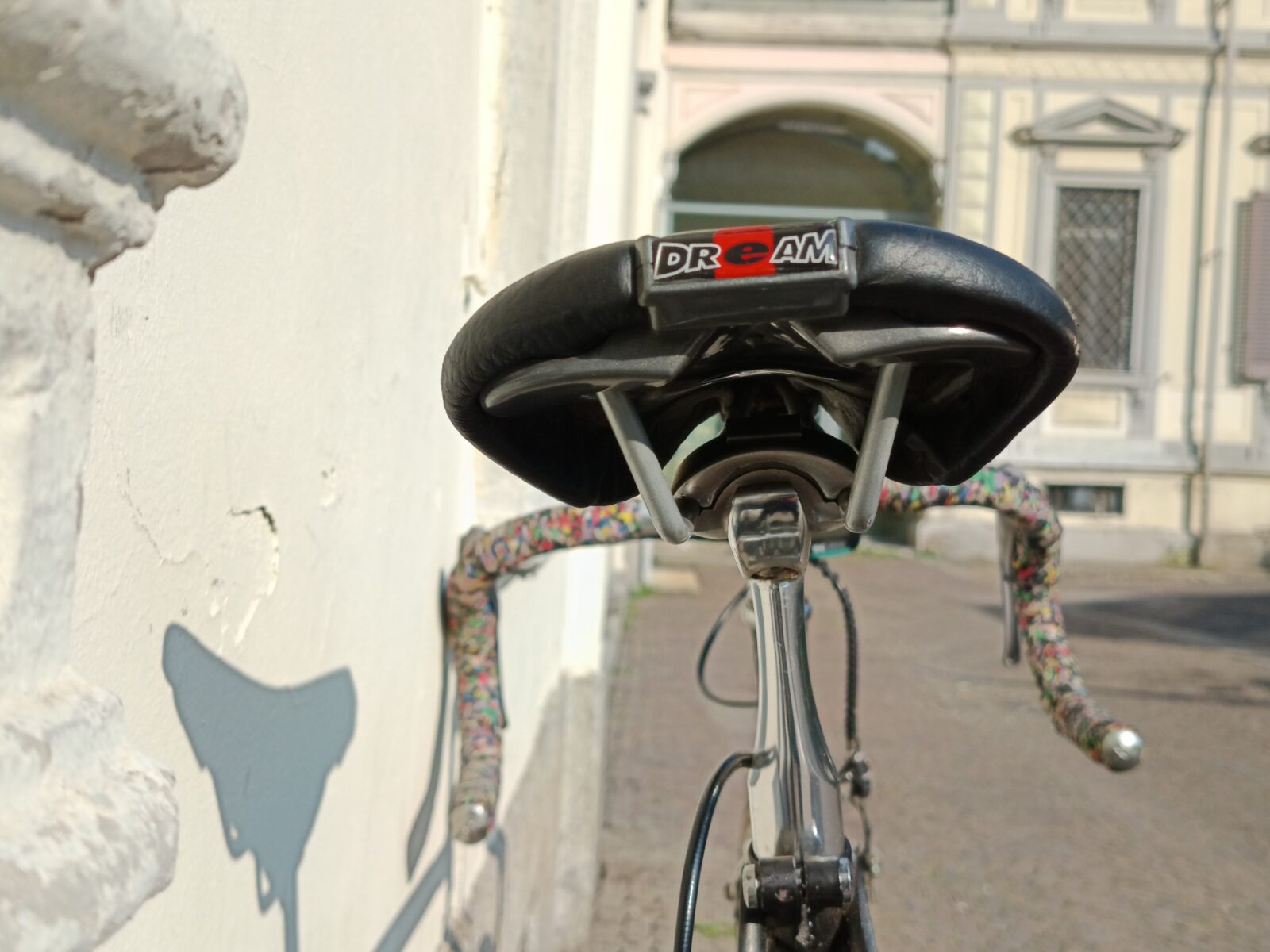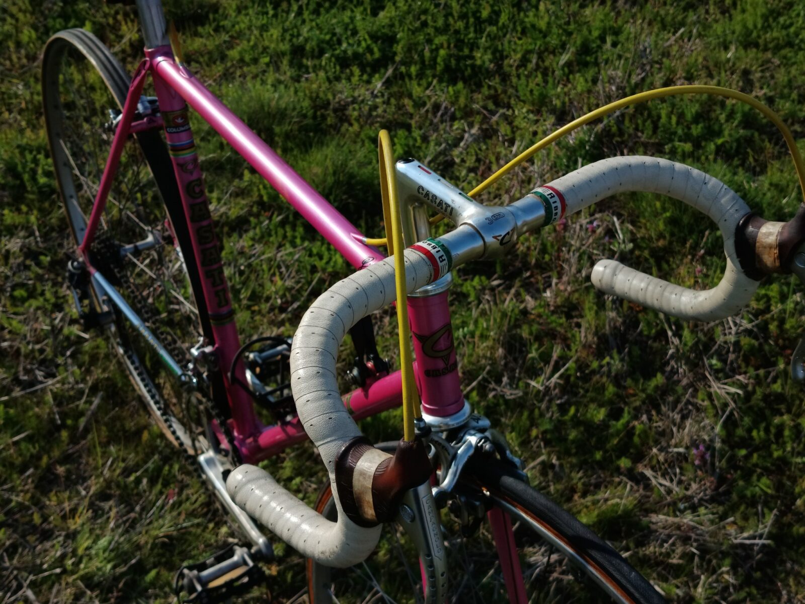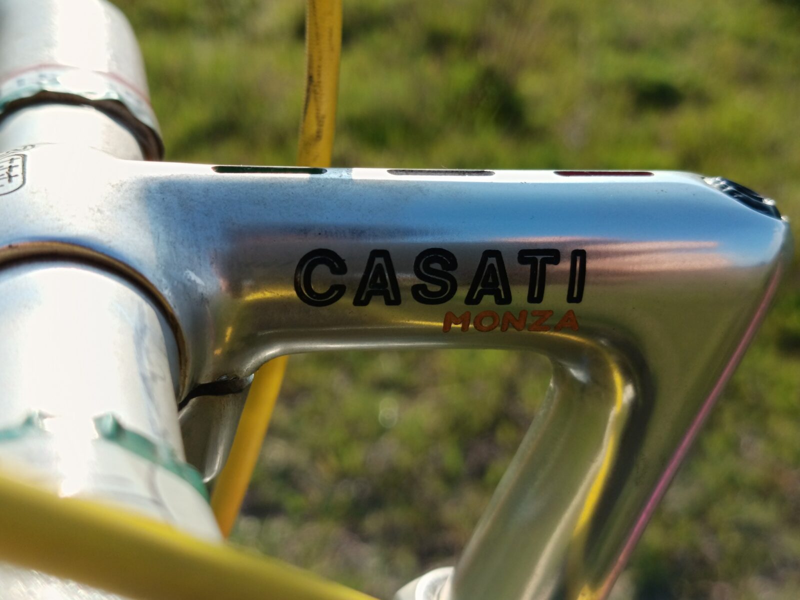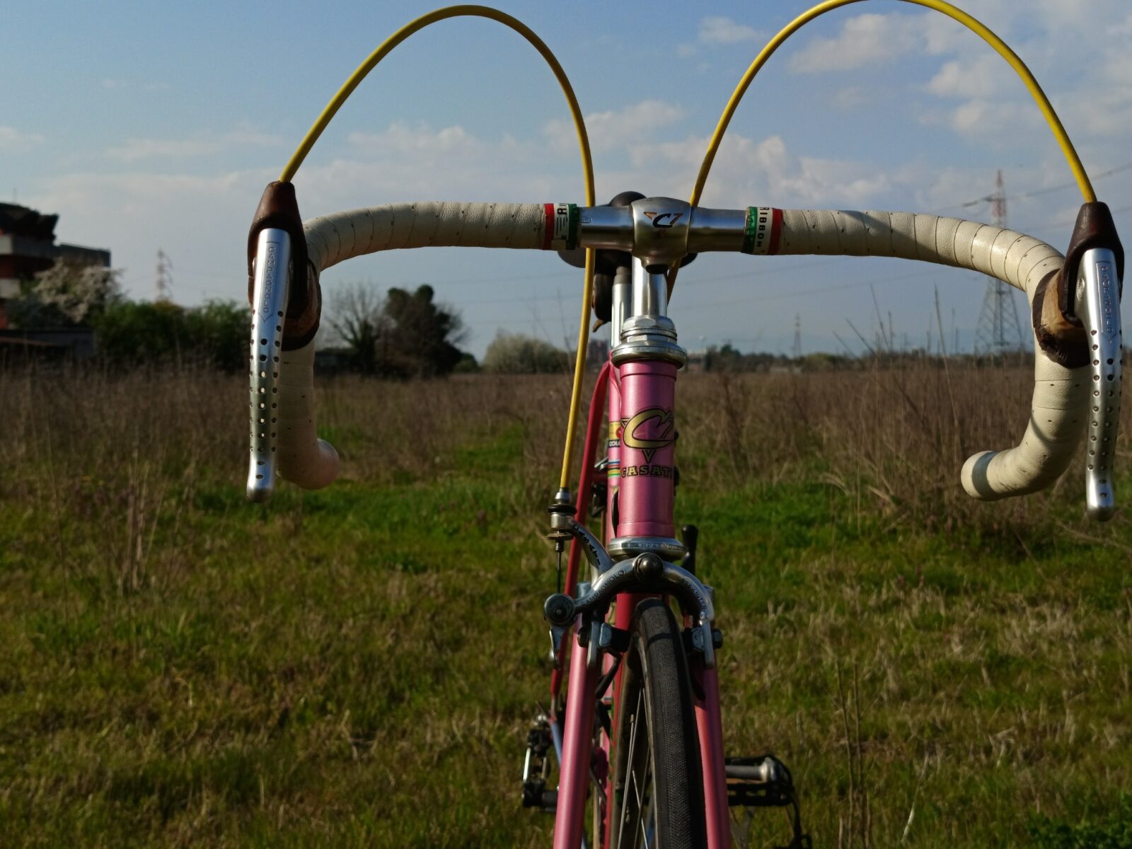 Molto coerente anche la componentistica: il gruppo Campagnolo, con deragliatore, freni e comandi d’epoca, si integra perfettamente con lo spirito del telaio. Non è solo una scelta tecnica, ma anche culturale: Casati e Campagnolo rappresentano insieme una certa idea di ciclismo italiano, fatta di precisione meccanica e gusto estetico. Le guaine gialle, il nastro manubrio chiaro e i dettagli cromati creano un contrasto interessante con il telaio, dando alla bici una personalità forte ma mai disordinata.
