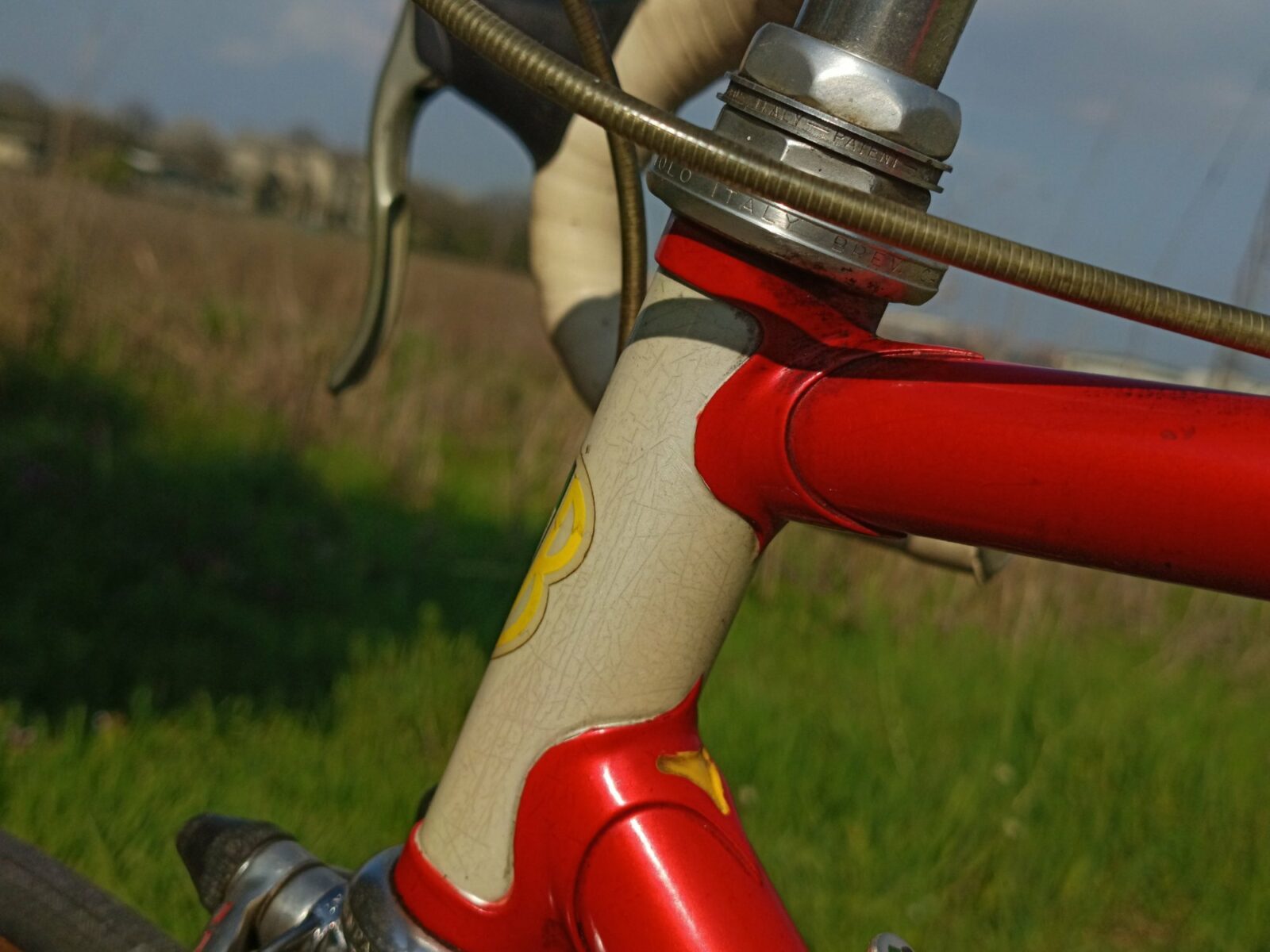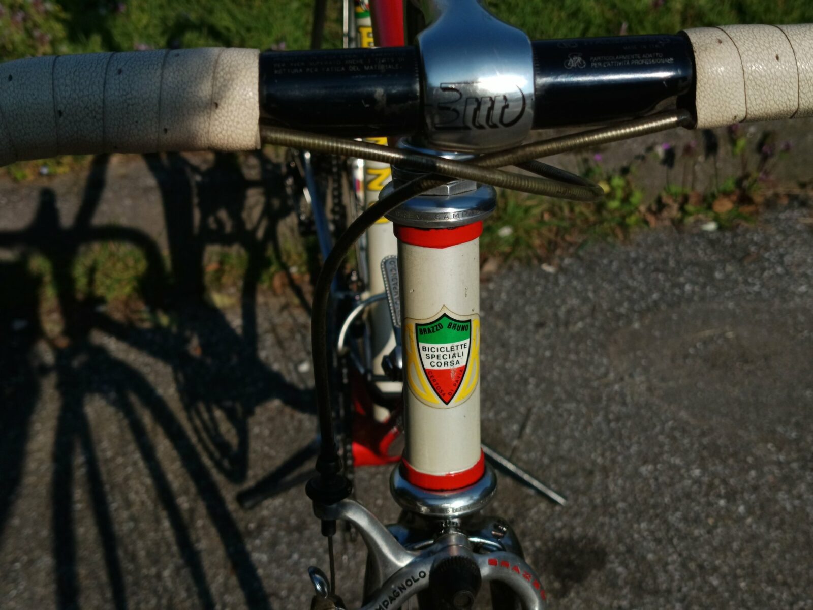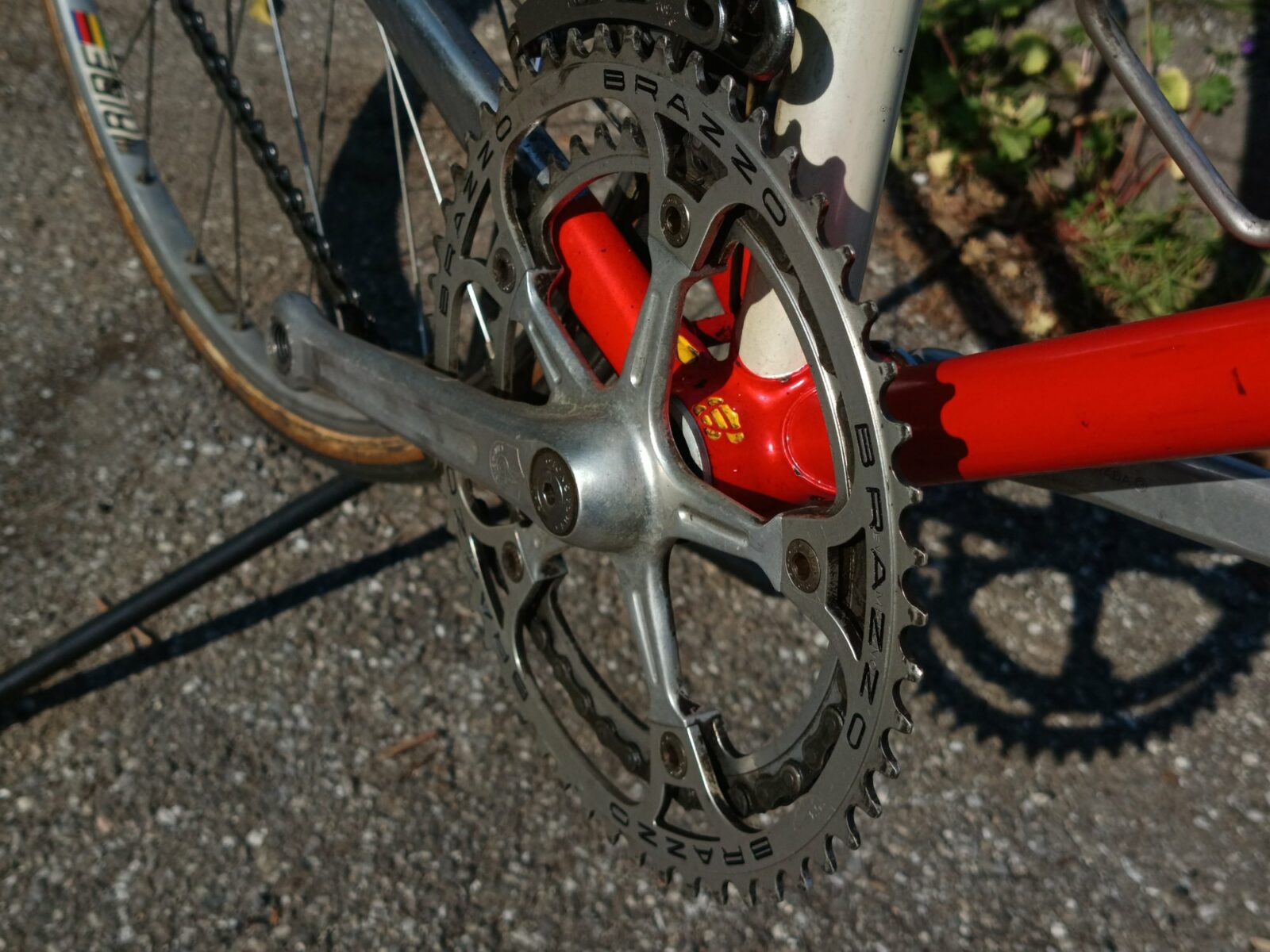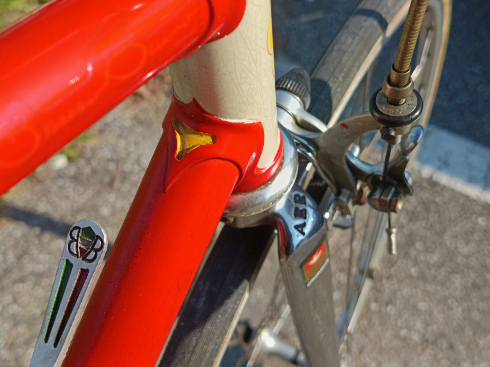 Il telaio colpisce subito per la sua livrea bicolore, con il rosso vivo che dialoga con il bianco panna, una combinazione tipica di molte produzioni italiane tra gli anni ’70 e ’80. Le congiunzioni lavorate, i dettagli verniciati con cura e i piccoli inserti decorativi mostrano chiaramente una mano esperta dietro alla costruzione. Brazzo, realtà meno conosciuta rispetto ai grandi nomi, si inserisce proprio in quel panorama di officine italiane che producevano telai di qualità, spesso su scala ridotta, ma con standard tecnici molto alti.