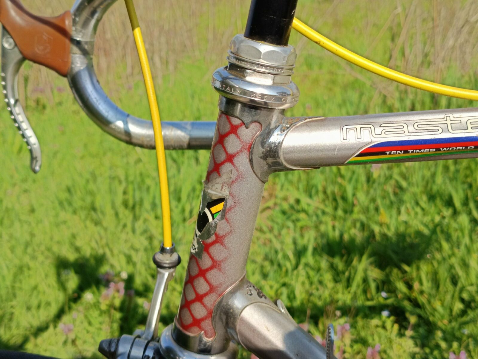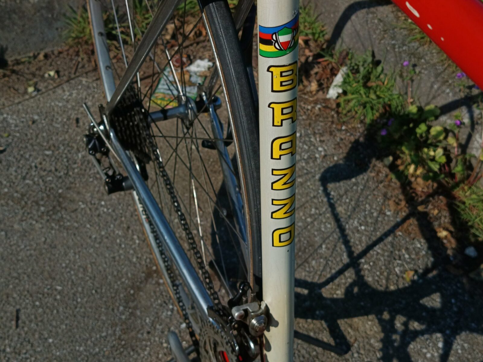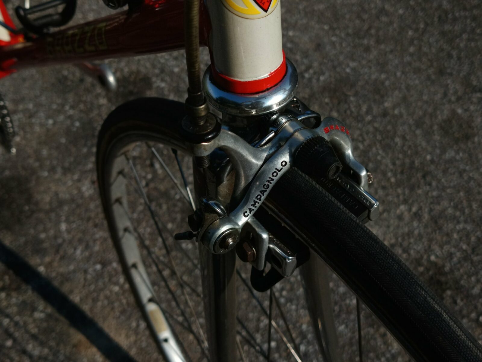 Il telaio colpisce subito per la sua livrea bicolore, con il rosso vivo che dialoga con il bianco panna, una combinazione tipica di molte produzioni italiane tra gli anni ’70 e ’80. Le congiunzioni lavorate, i dettagli verniciati con cura e i piccoli inserti decorativi mostrano chiaramente una mano esperta dietro alla costruzione. Brazzo, realtà meno conosciuta rispetto ai grandi nomi, si inserisce proprio in quel panorama di officine italiane che producevano telai di qualità, spesso su scala ridotta, ma con standard tecnici molto alti.