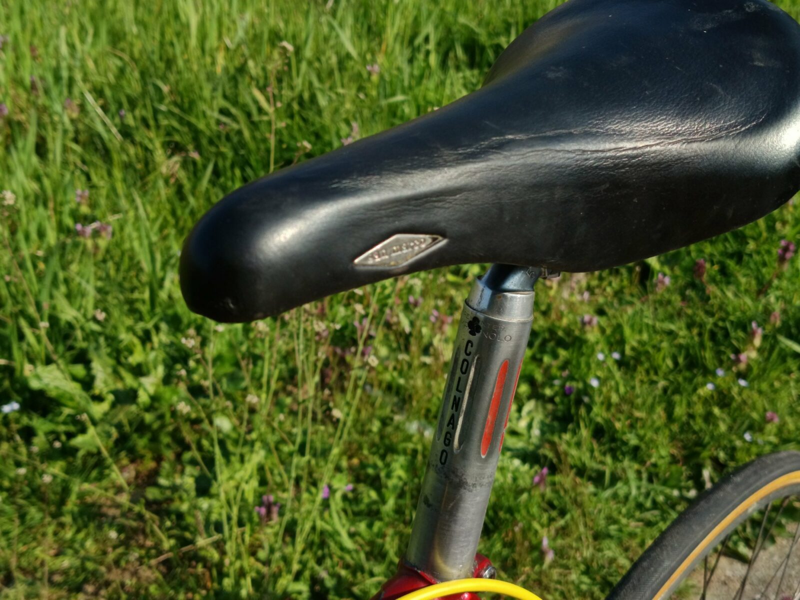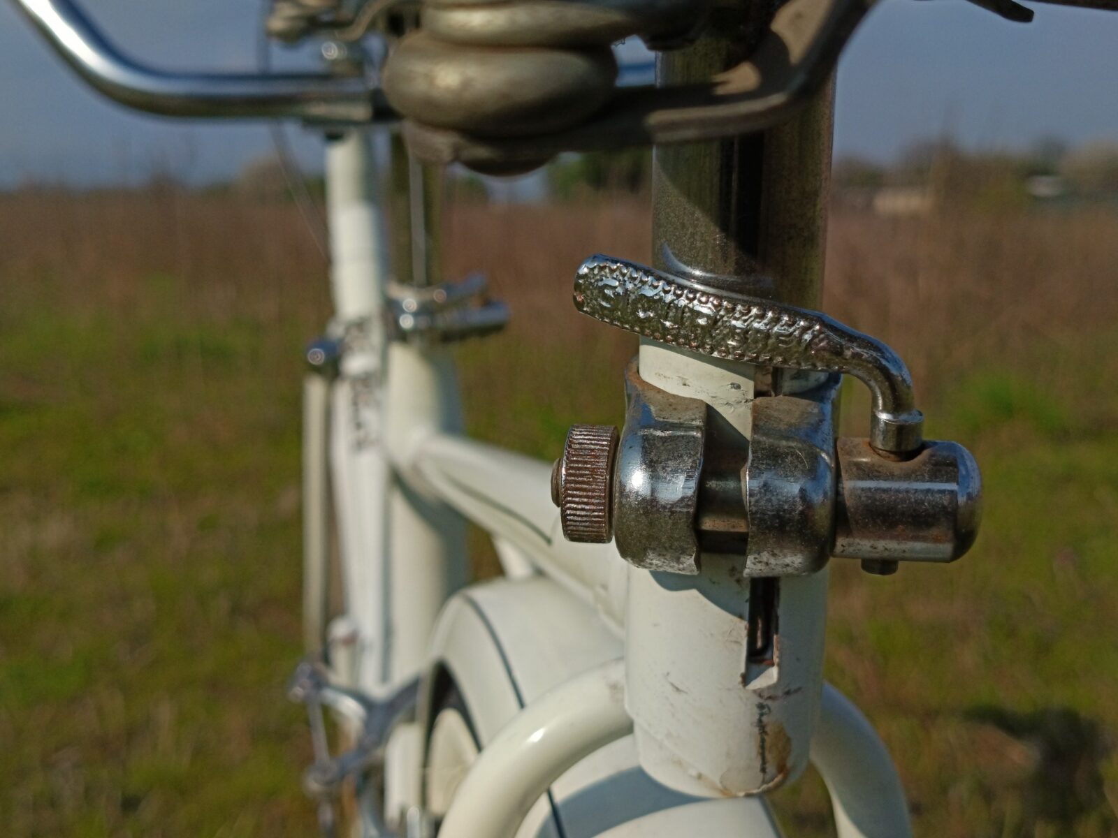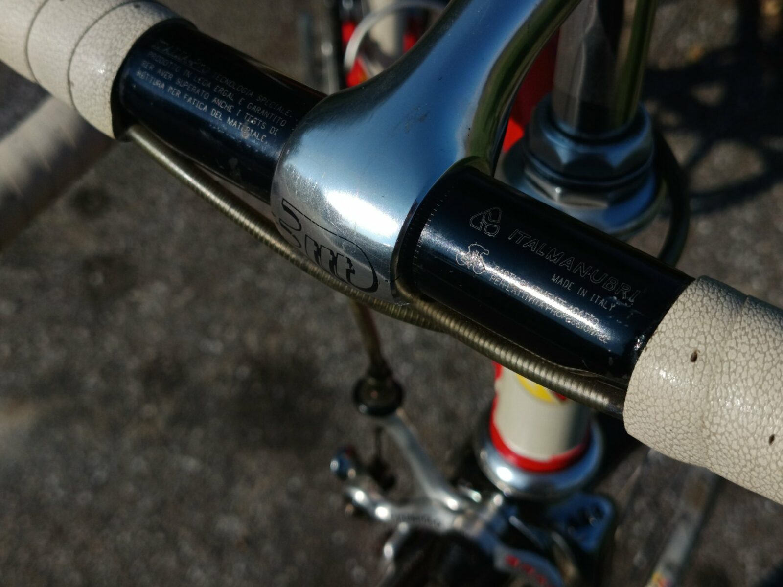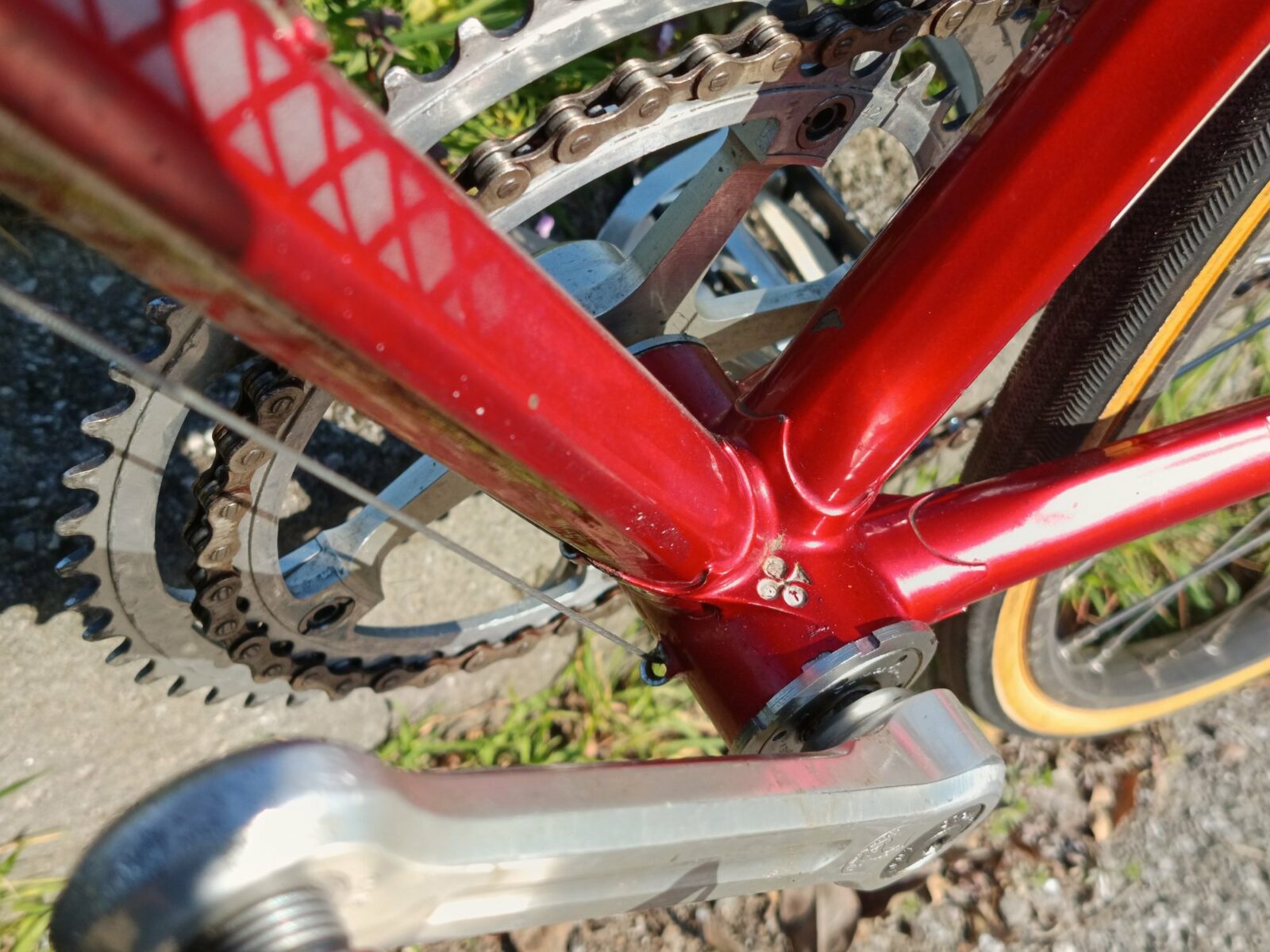 Il telaio colpisce subito per la sua livrea bicolore, con il rosso vivo che dialoga con il bianco panna, una combinazione tipica di molte produzioni italiane tra gli anni ’70 e ’80. Le congiunzioni lavorate, i dettagli verniciati con cura e i piccoli inserti decorativi mostrano chiaramente una mano esperta dietro alla costruzione. Brazzo, realtà meno conosciuta rispetto ai grandi nomi, si inserisce proprio in quel panorama di officine italiane che producevano telai di qualità, spesso su scala ridotta, ma con standard tecnici molto alti.