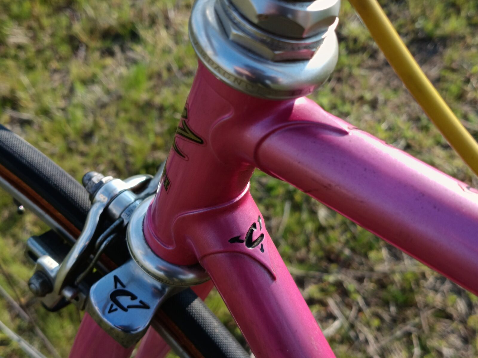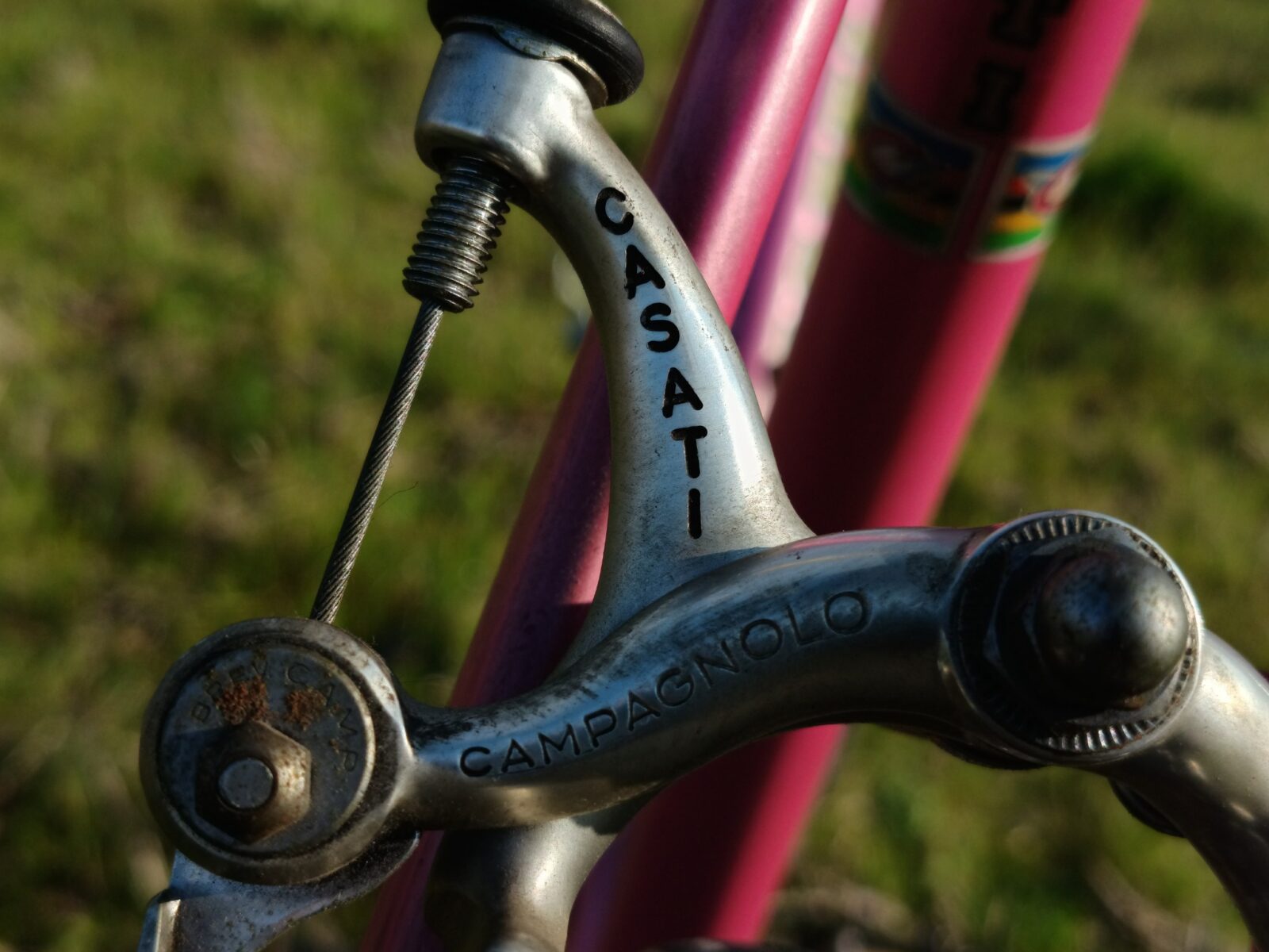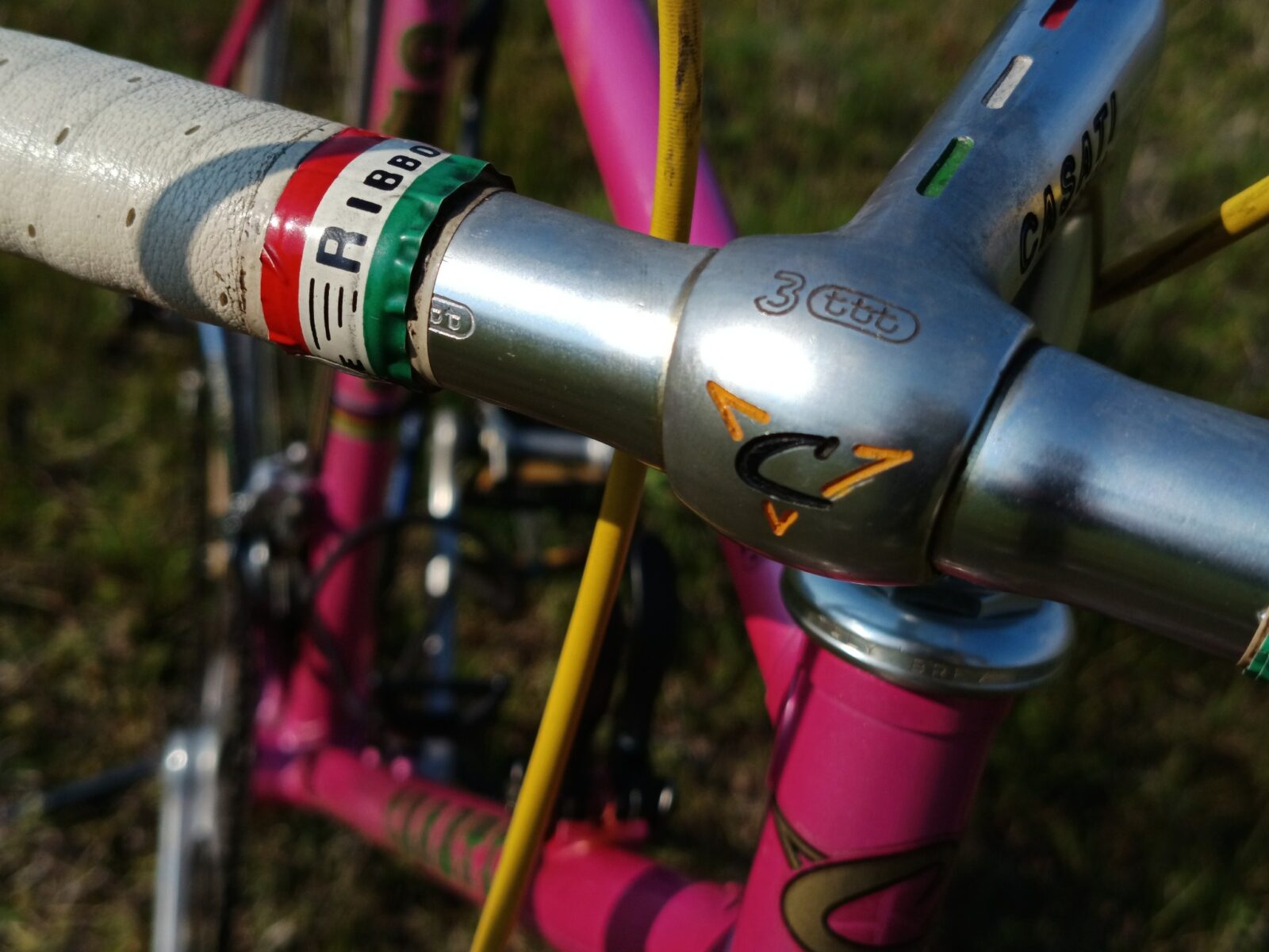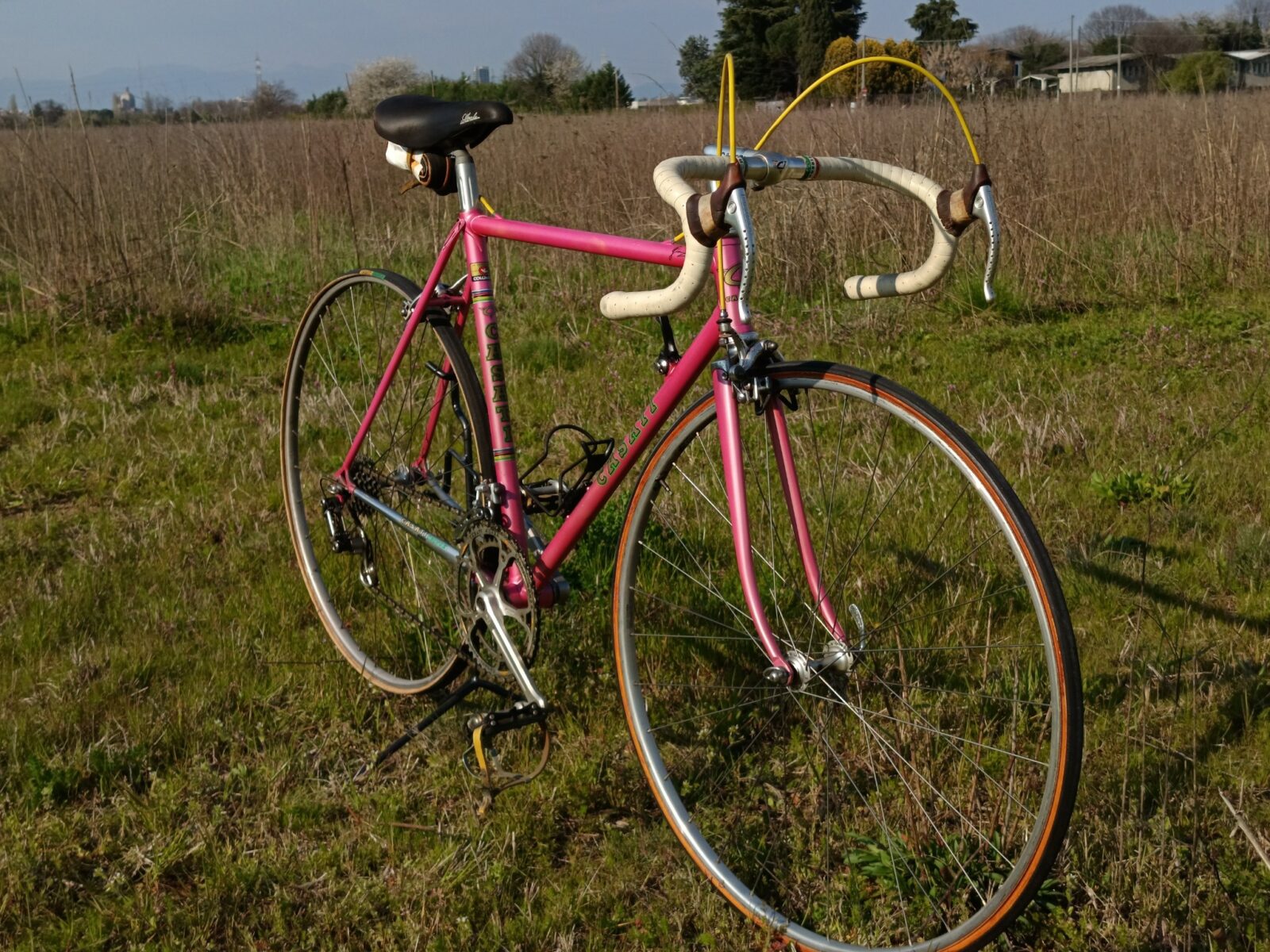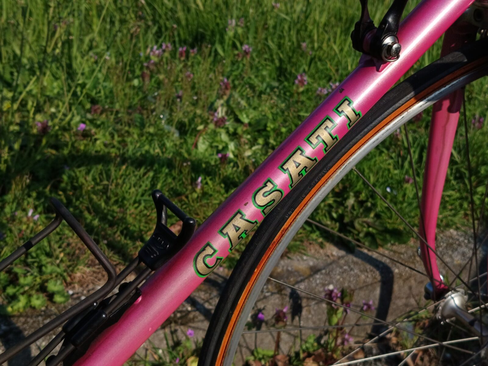 “Questa bici incarna in modo molto riconoscibile lo stile di Casati, storico marchio italiano nato a Monza e sempre legato a una visione elegante e artigianale della bici da corsa. Già al primo sguardo emerge quella combinazione tipica del brand: linee classiche, proporzioni pulite e una forte identità visiva, qui enfatizzata da una verniciatura rosa accesa che richiama certe interpretazioni più personali e distintive della produzione anni ’80-’90.